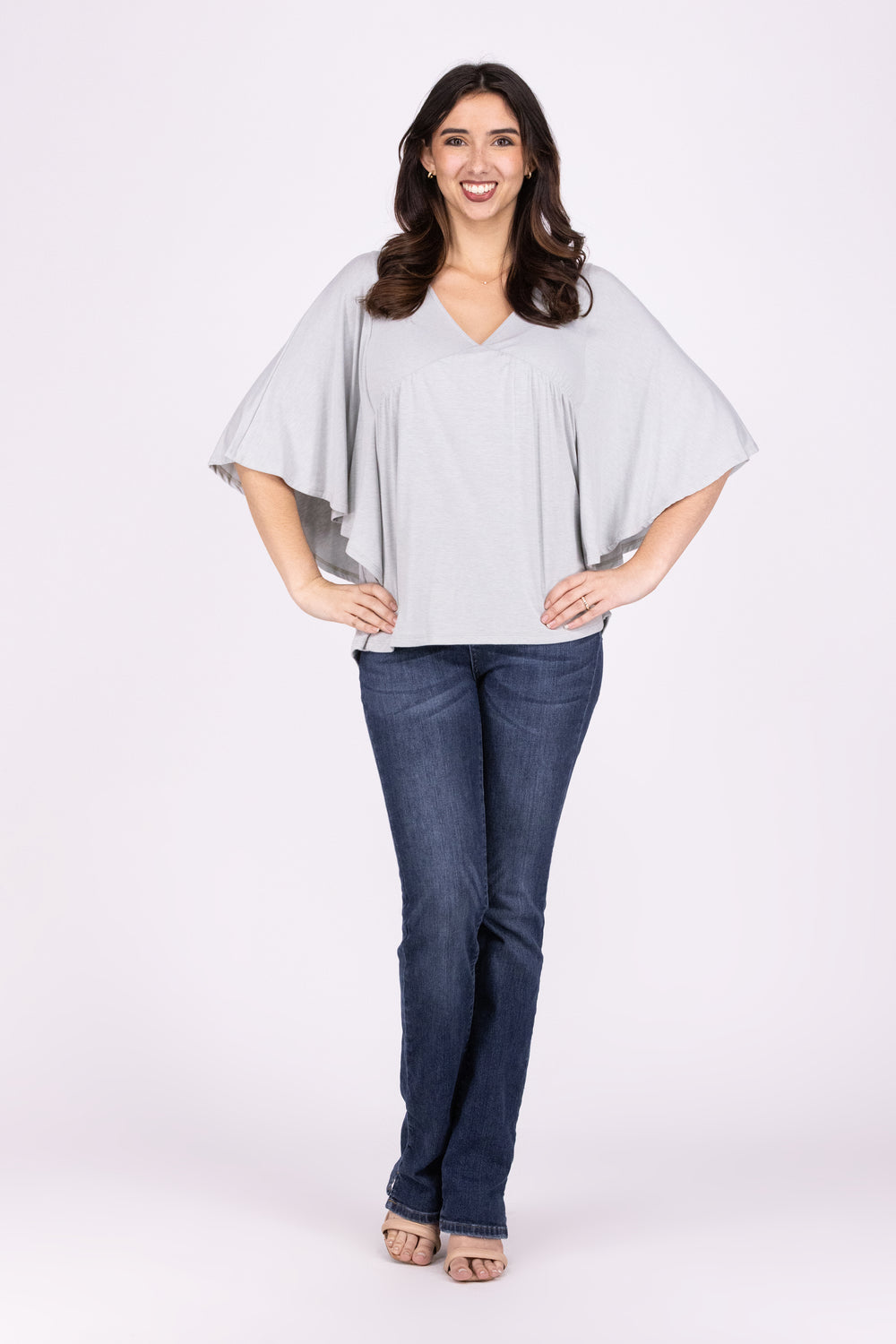 The Power Top by Oddi is a short sleeve poncho style top, featuring a V-neckline, a gathered front, and poncho style sleeves. This solid colored top is a relaxed, non sheer top with a hi-lo hemline, and unique ruffle sleeves. Goes great with denim