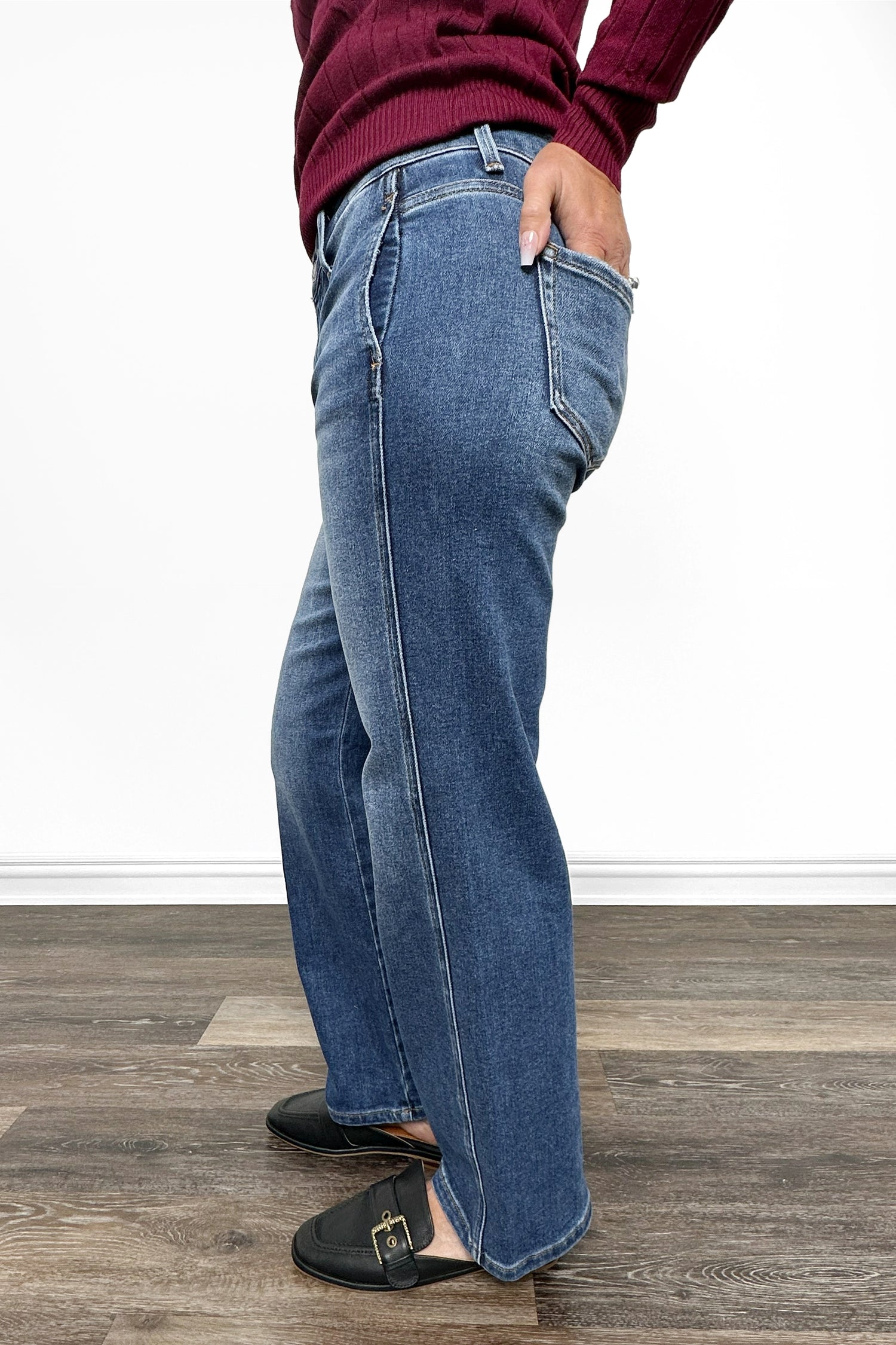 Ankle Straight Fit: Streamlined through the hips and thighs with a straight cut that hits right at the ankle for a modern, versatile look.