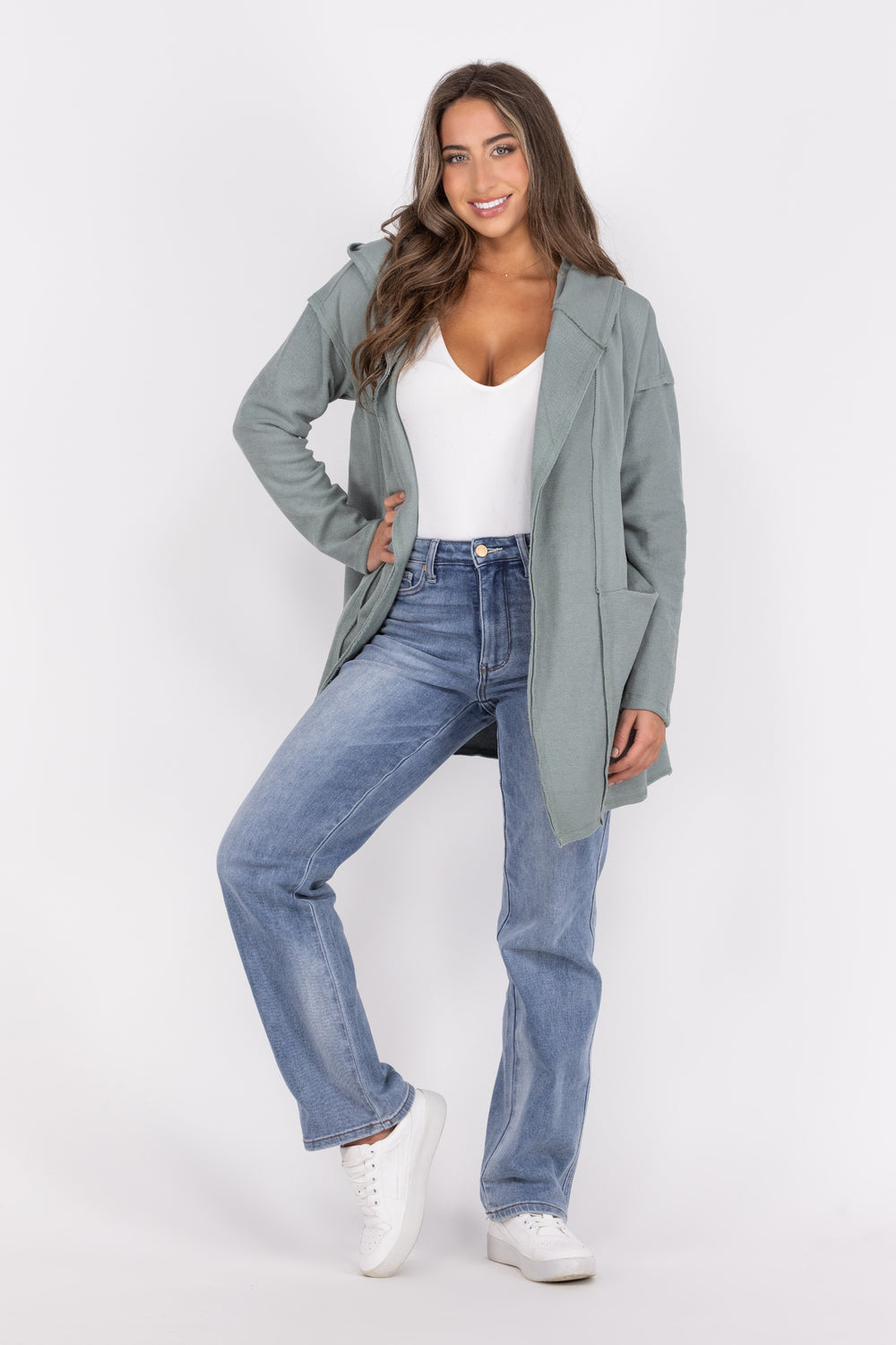 The World is Yours Cardigan by Heyson is perfect for those who want to take on the world. It features an open front, long sleeves, front pockets, exposed stitched detailing and a hooded neckline. Pair with our "When You're Around Reversible Tank Top" and our "Judy Blue Have To Have It High-Rise Tummy Control Straight Leg Denim" to complete an adorable look.