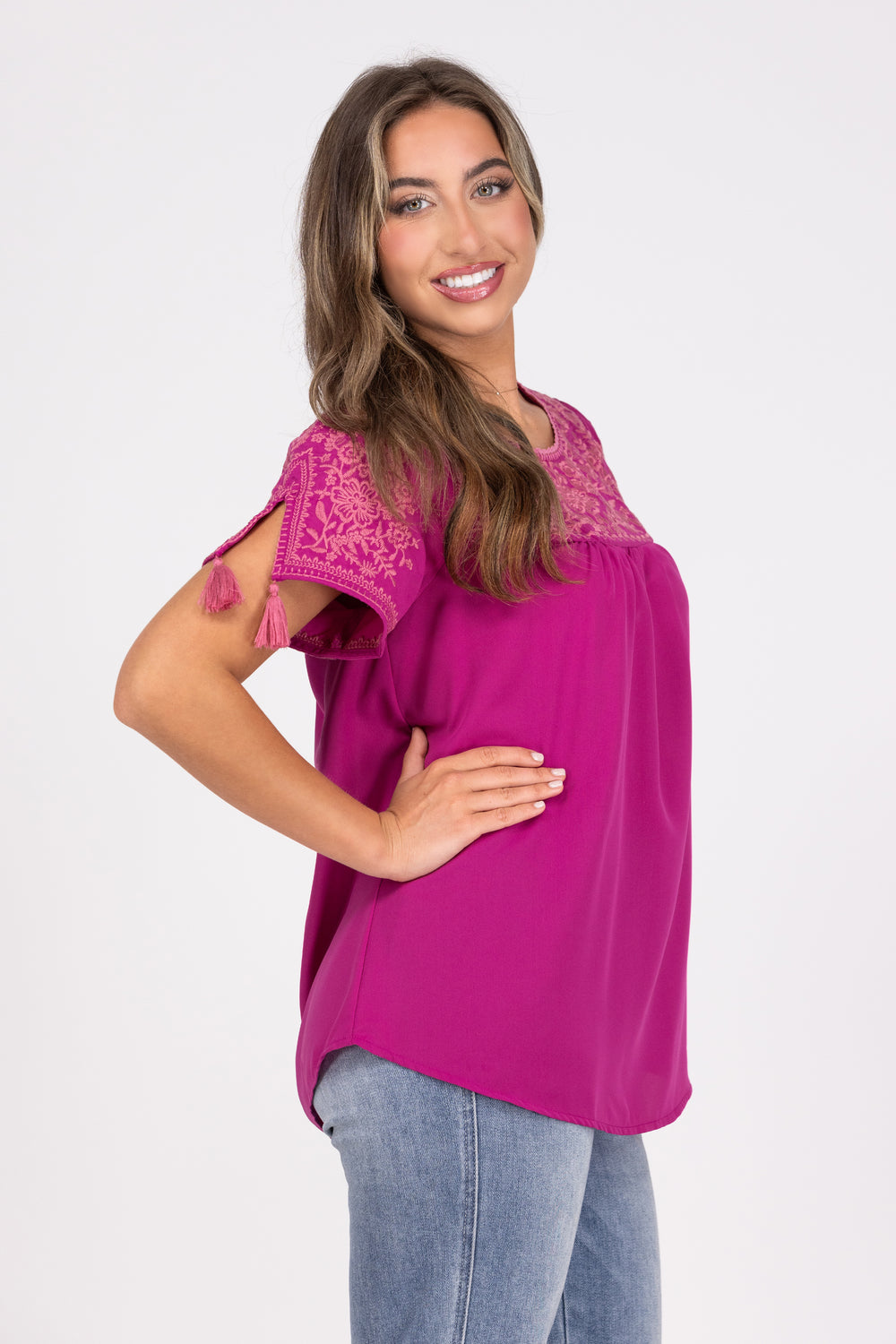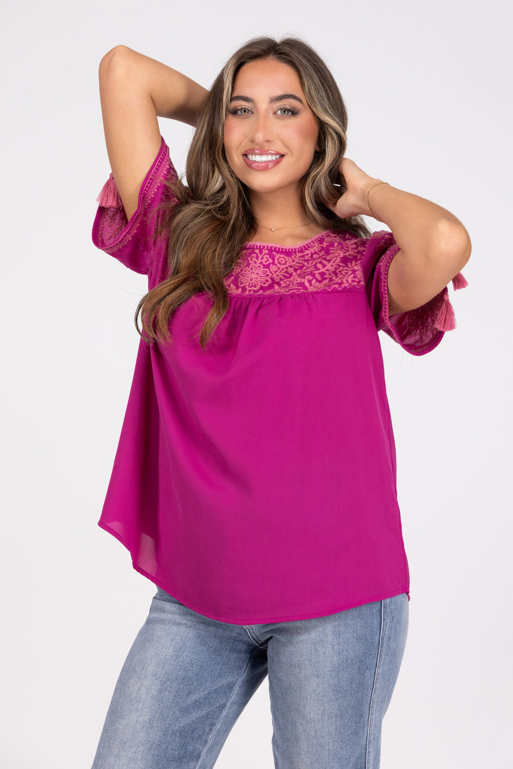 This Girl Is On Fire Top from Andree By Unit will make you feel like you are on fire! This beautiful solid blouse features a round neckline, pleating for flattering silhouette, and beautiful Savanna Jane floral embroidery on chest, and short sleeves with slit and tassels. This Girl Is On Fire Top can be paired with a pair of nice dress slacks for a more dressed up look or with your favorite denim and wedges!
