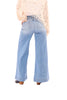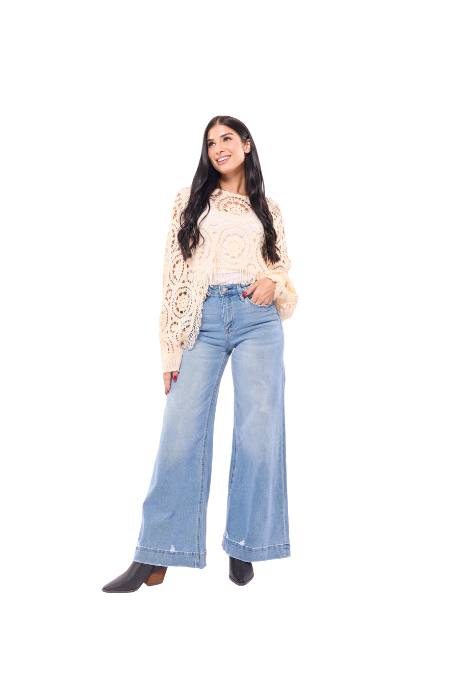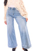 These medium wash wide leg jeans offer that perfect balance of relaxed comfort and structured style. With a high rise that elongates the legs and defines the waist, this style flares out from the hips down to the hem for a breezy silhouette with plenty of room to move. Thoughtful distressing on the pockets and destroyed patches near the hem add a touch of edge, giving these trousers a vintage, lived-in look.