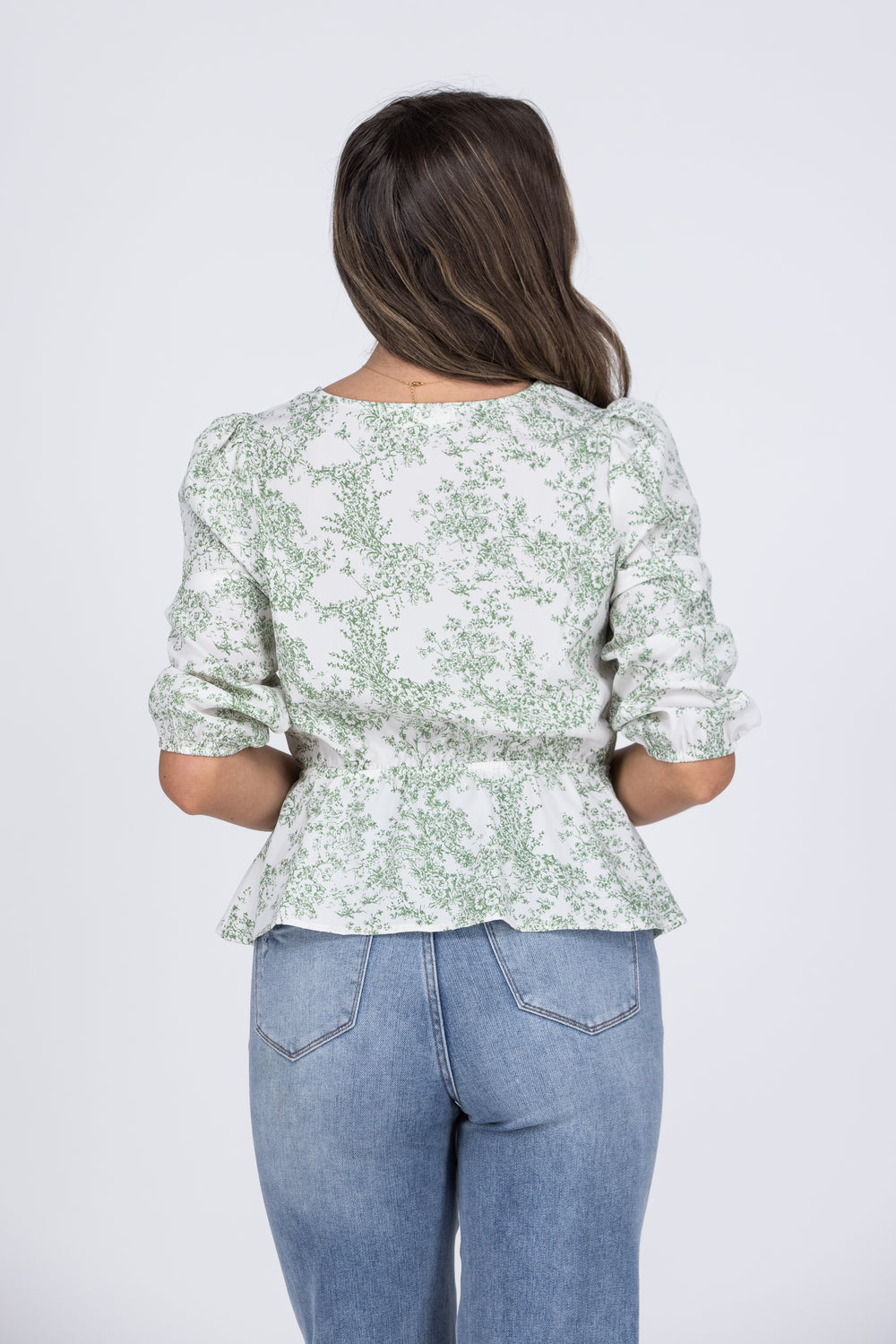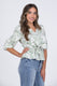 Make a bouquet of flowers in the Tie the Bouquet Top by Doe and Rae. This top features a V neckline, puffy shoulder sleeves, elastic cinch at your waist, with a tie to show off your waist, and a leafy flower pattern across the entire top. This top pairs well with slacks for a work look or with a fun skirt for a day of picking flowers and making bouquets.