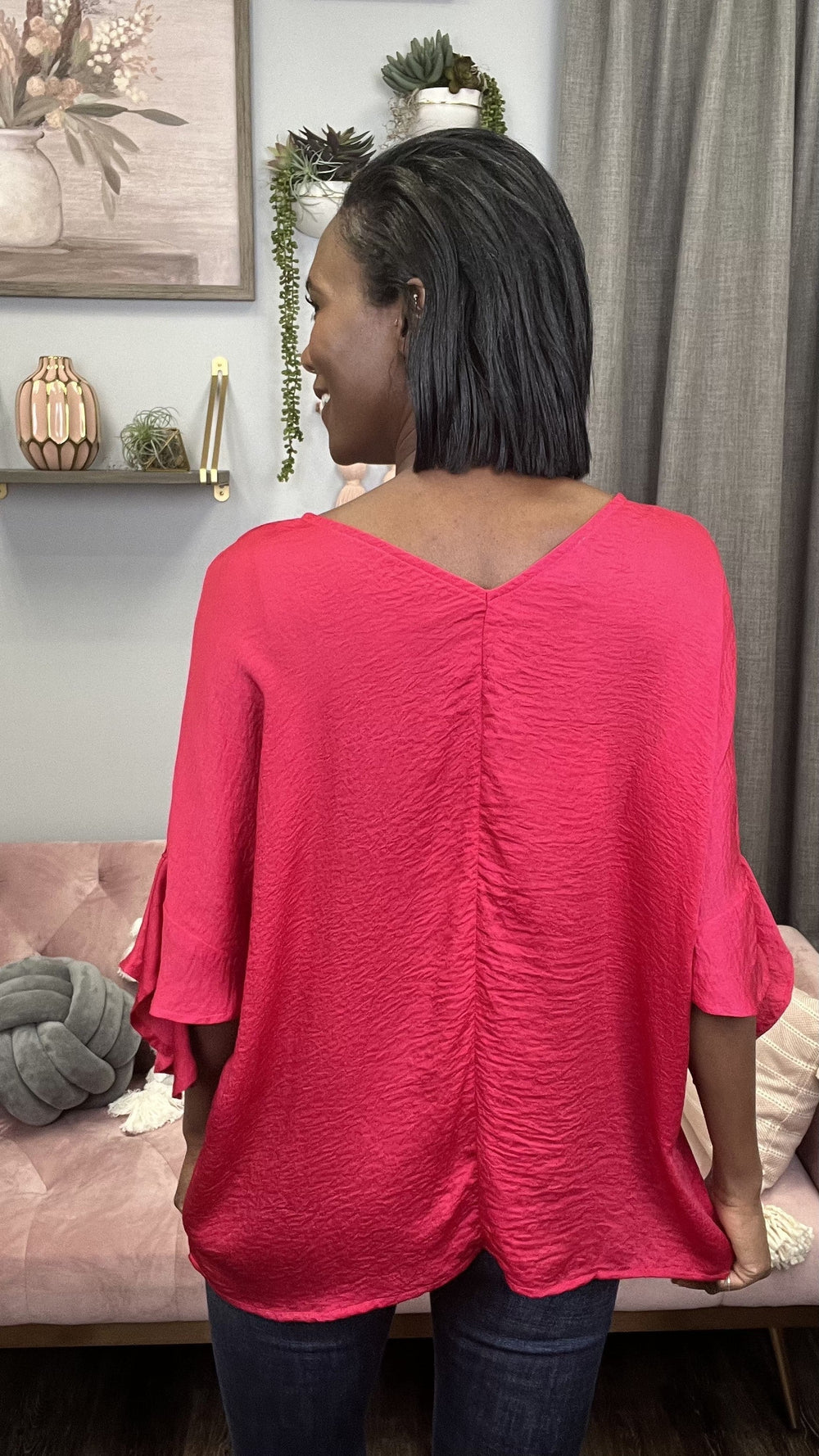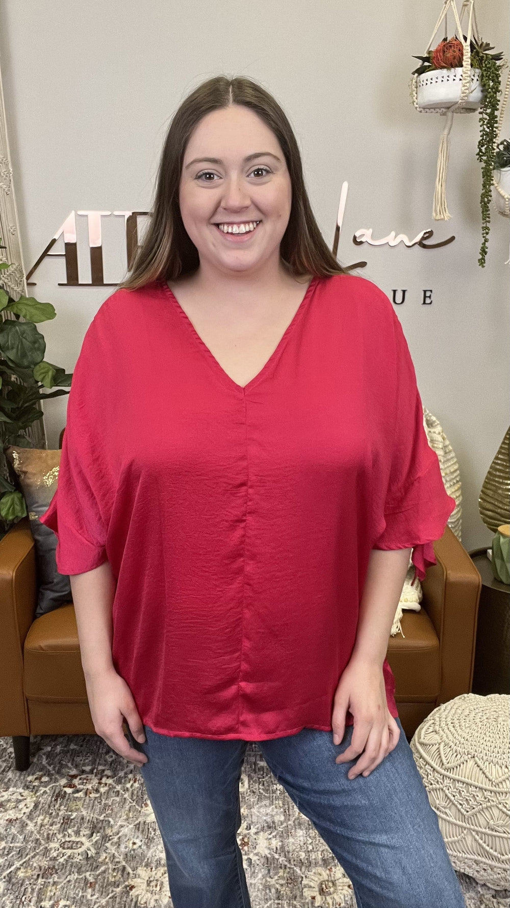 The Time To Flow Top by Easel is a beautiful satin top. It features a light weight fabric, V neckline, half wing sleeves with tie detail and a loose fitted bodice. The Time To Flow Top is perfect for any occasion and can be dressed up with a nice skirt or dress pants or more casual with your favorite dark or black denim.