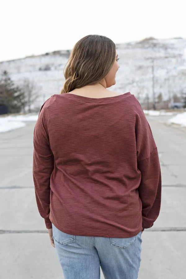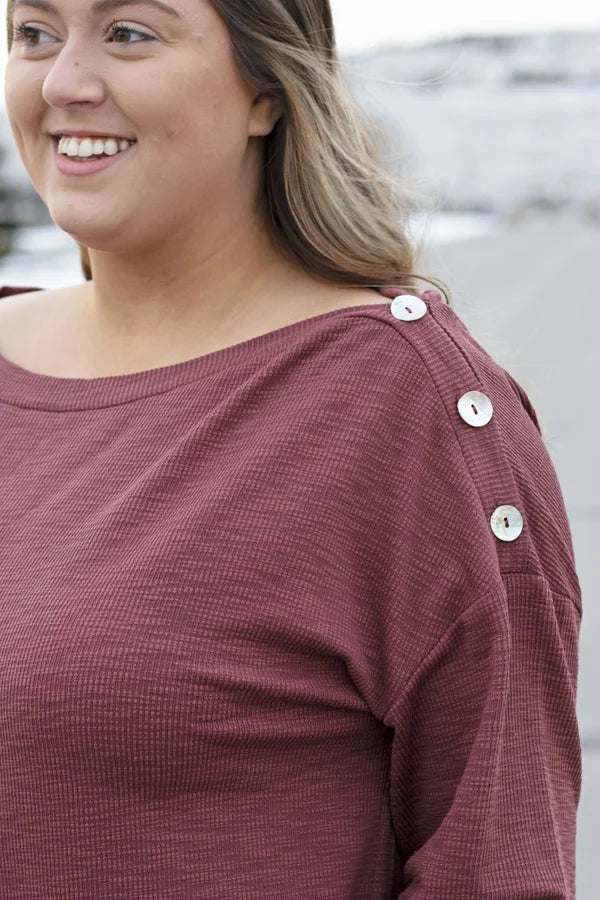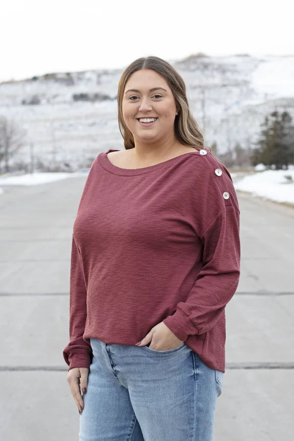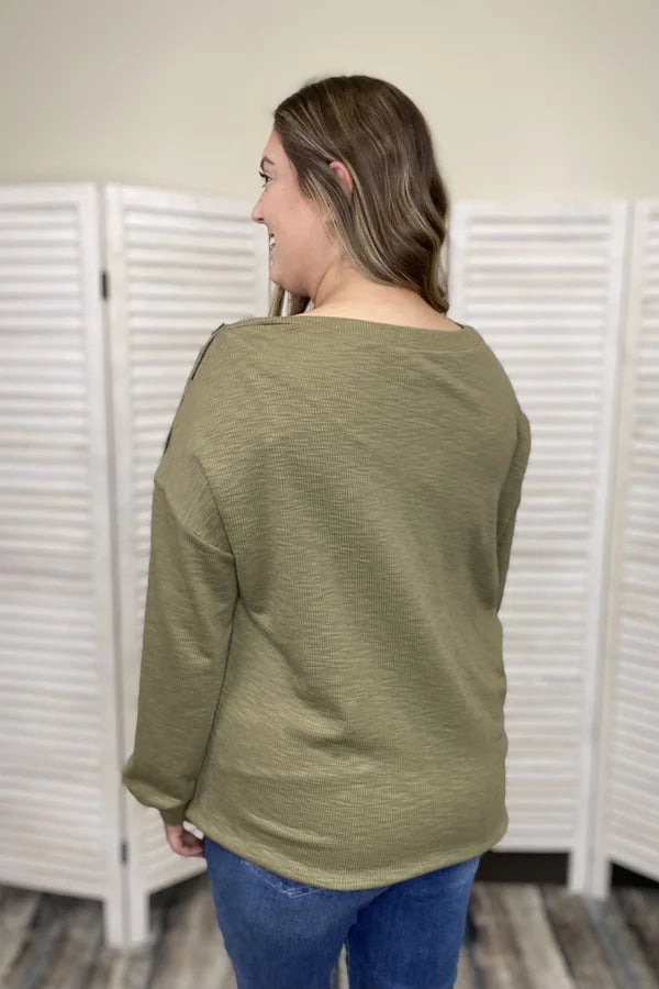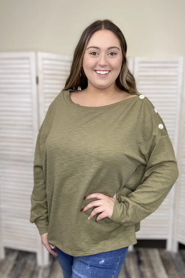 The To The Side Top By Listicle is a solid ribbed top. It features long sleeves with dropped shoulders, boat neckline with button down one shoulder, relaxed fit with stretch ribbed fabric. This top can be styled with denim or leggings!