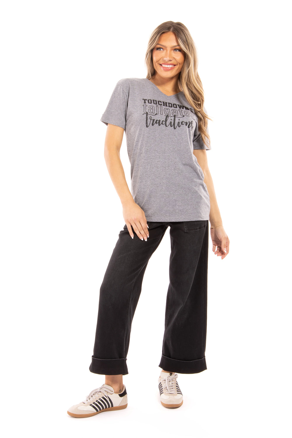The "Touchdowns, Tailgates, Traditions" Graphic Tee from The Royal Standard is the perfect tee to add to your closet this season. This graphic tee features a V-neck, and a distressed retro graphic. The "Touchdowns, Tailgates, Traditions" Graphic Tee is perfect for those football traditions!