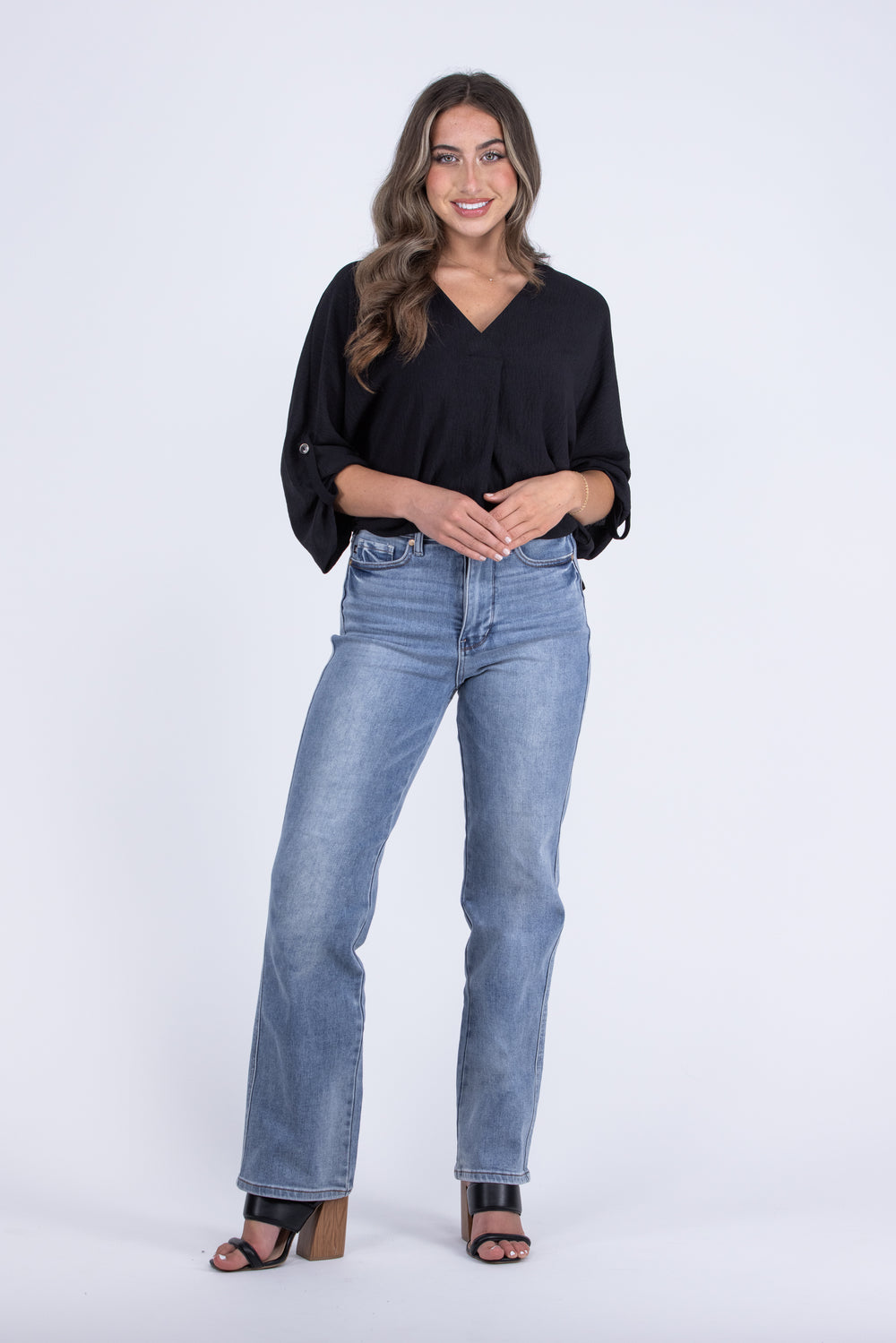 Take this light weight Travel Together Top from Andree by Unit on any vacation for a casual/dressy look for any occasion. Features a V neckline, pleat detail on front, button tab sleeve, slit on both sides of straight hemline. Pair it with leggings, straight leg jeans with your favorite knee boots, heals, or flats.