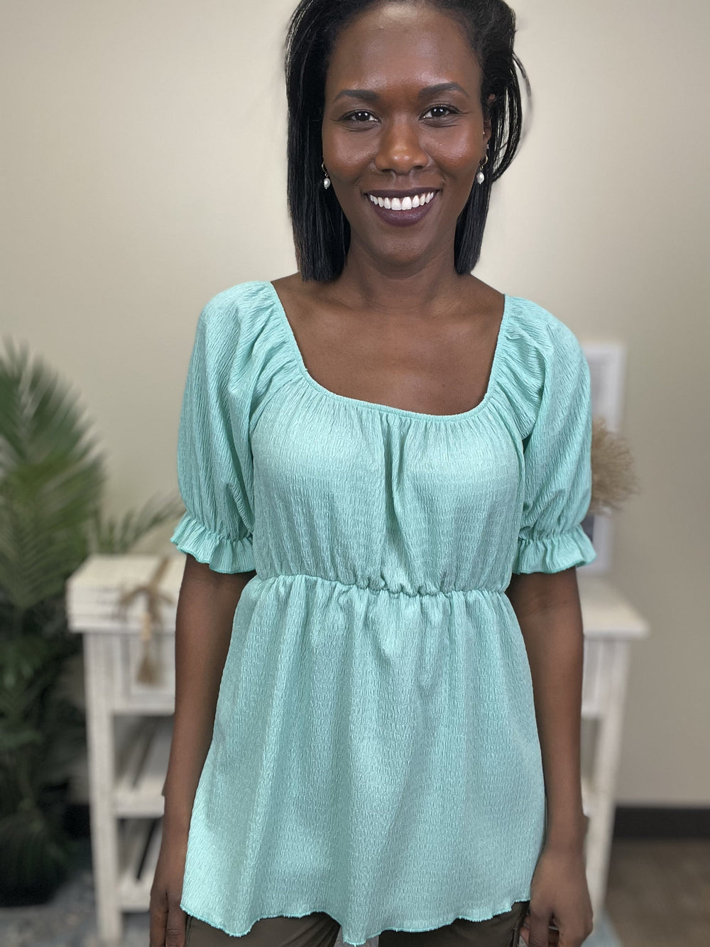 The Trial and Error Top by White Birch is a short sleeve solid knit top with a square neck featuring an elastic waist, a hi-lo rounded hemline, and puff sleeves. Fabric is a lightweight textured knit.