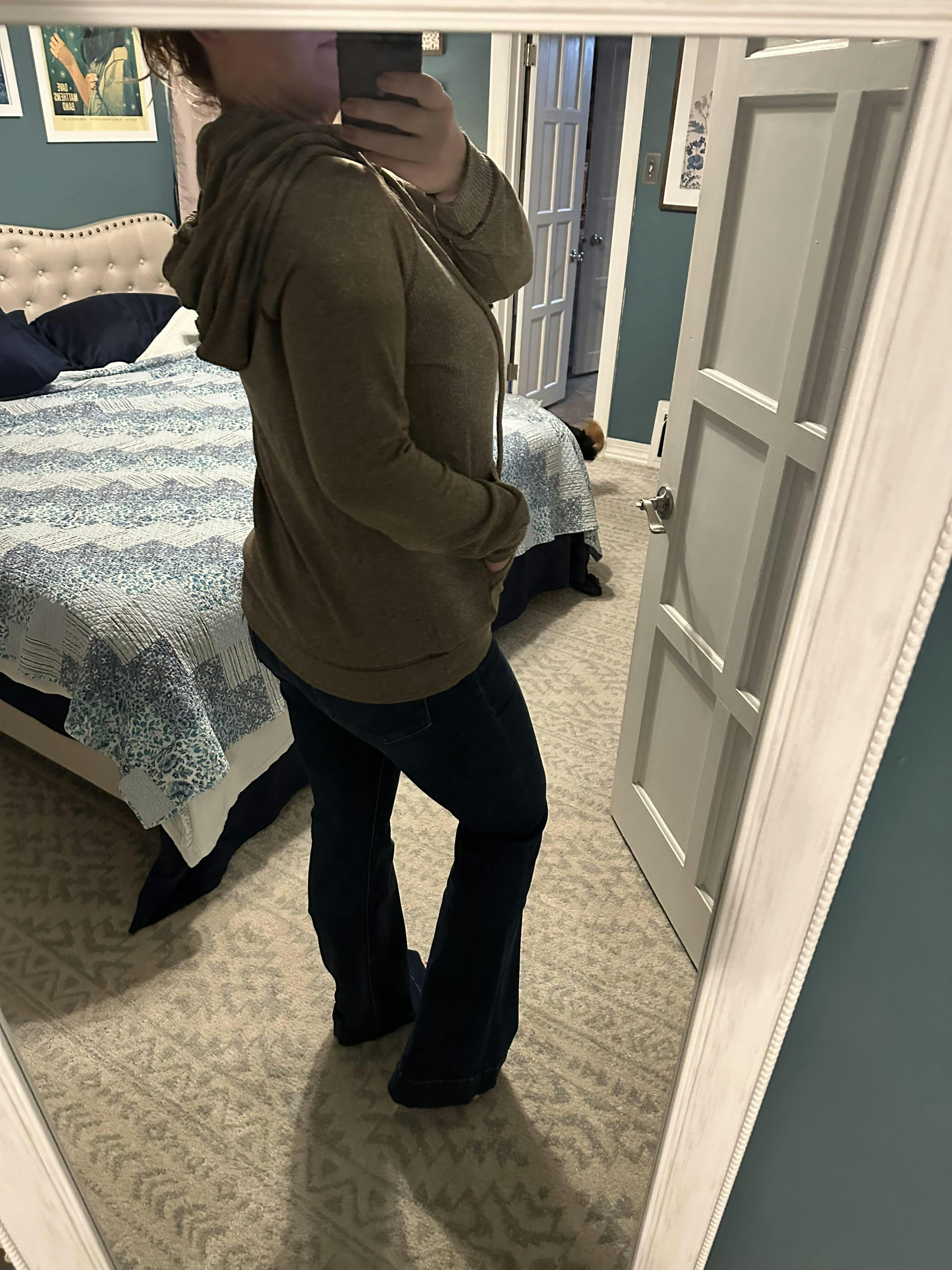 The True You Hoodie by White Birch is an untraditional long sleeve knit top, half knit, half ribbed knit, featuring 2 off centered hoods, with functional drawstrings, button accents, exposed stitching accents, and a front pouch pocket. This unique hoodie is extremely soft, and goes great with denim and leggings.