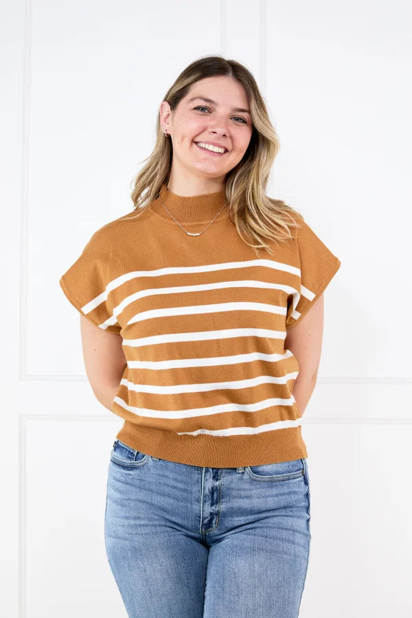 Turn your day around with the Turning It Around Top by Ee:some. This top features a mock neck, slight cap sleeve, horizontal stripes, and a ribbed bottom band. This top will pairs great with your favorite denim or a cute skirt.