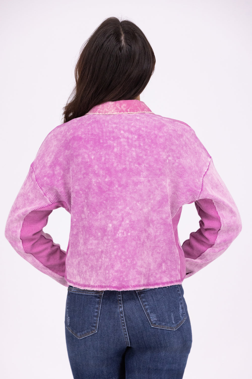 Indulge in some playfully delicious fashion with our Ube Waffle Cropped Jacket from Mystree! This unique jacket features a soft waffle knit fabric for a cozy feel, while its washed look adds a touch of edginess. With a button down front and breast pockets, this jacket is both stylish and functional. Satisfy your fashion cravings with our Ube Waffle Cropped Jacket today!