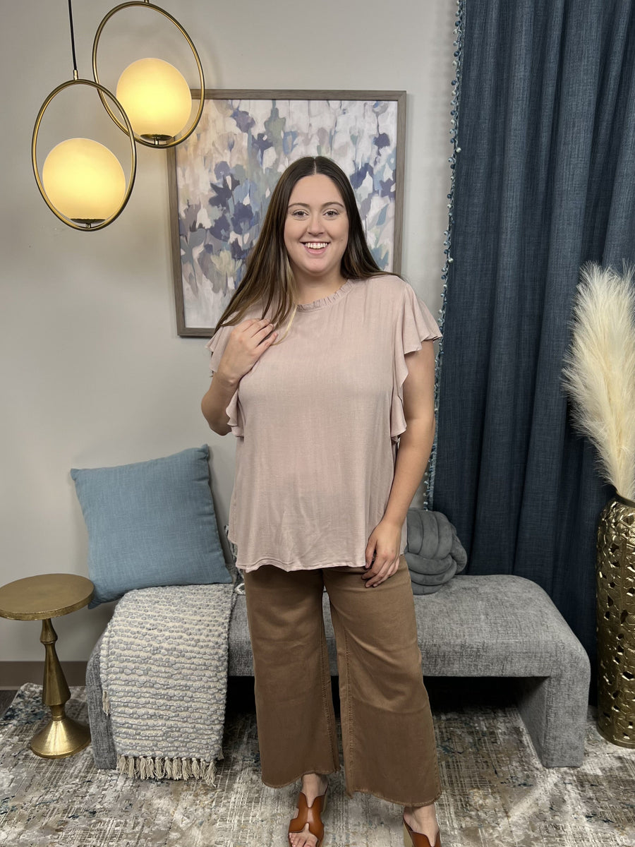 The Up And Moving Top from Andree by Unit will go with every outfit and and any accessory! The perfect blank palette! It features a ruffled mock neckline, keyhole back with button closure, short ruffled sleeves, and a round hemline. This short sleeve top can easily go from spring to summer by layering over it or not!