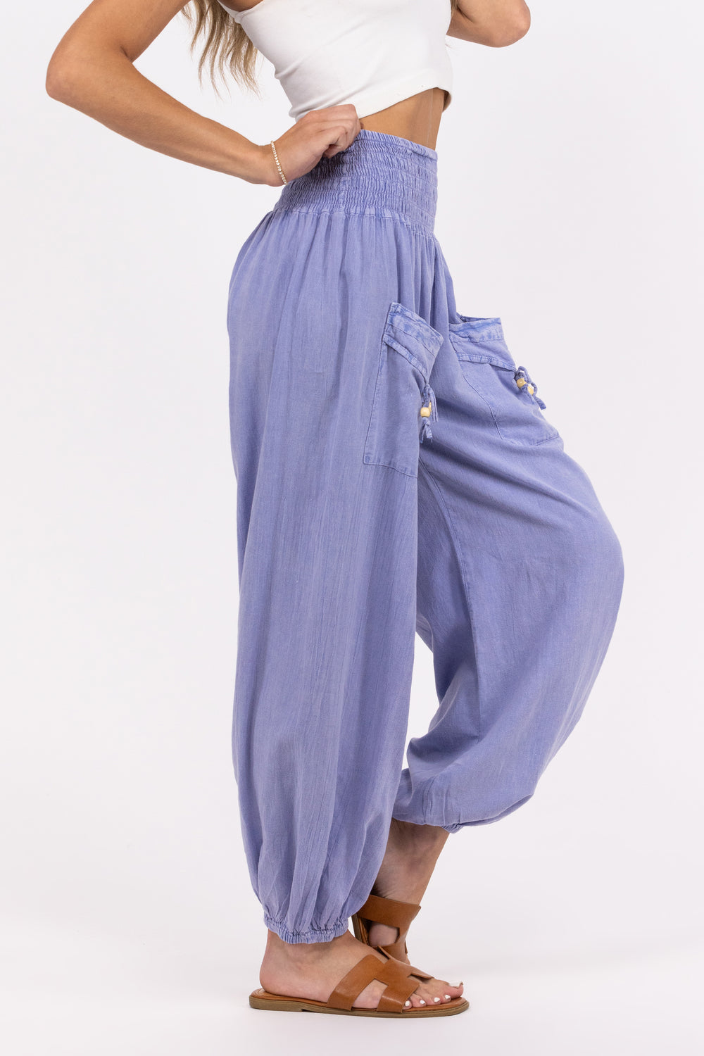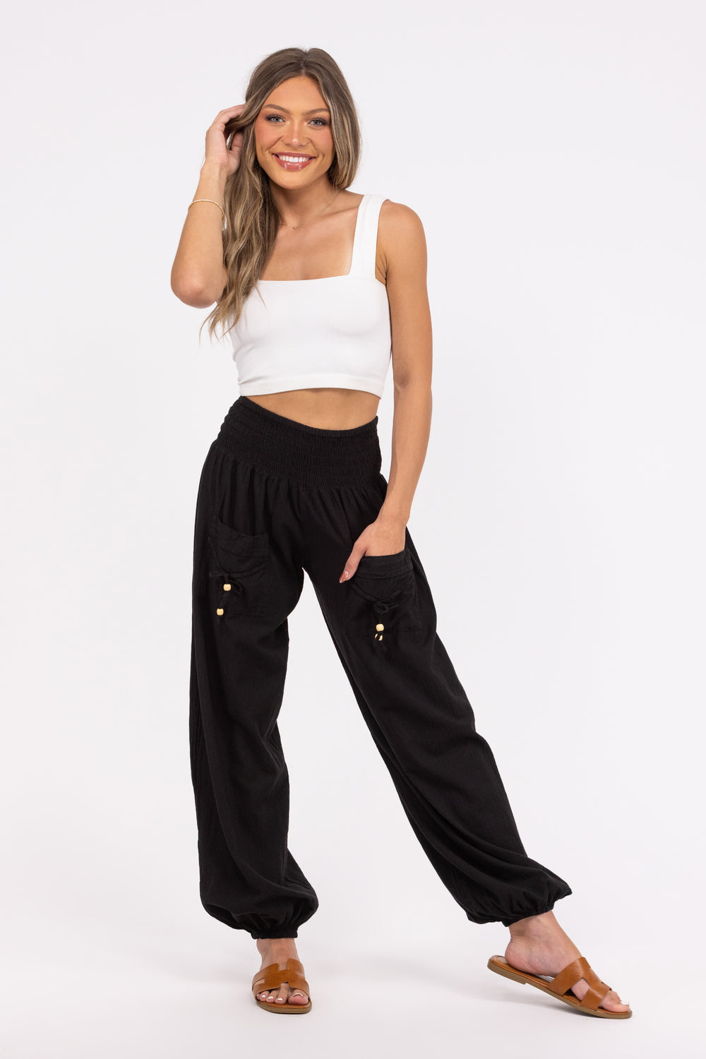 The Vacation Mode Pants from Giocam are the perfect pants for everyone. These pants feature a smocked waistband, 2 pockets with beaded detail strings, balloon like pant legs, and jogger styled ankle cuffs. The Vacation Mode Pants can be worn on the beach or even for a day of errands!