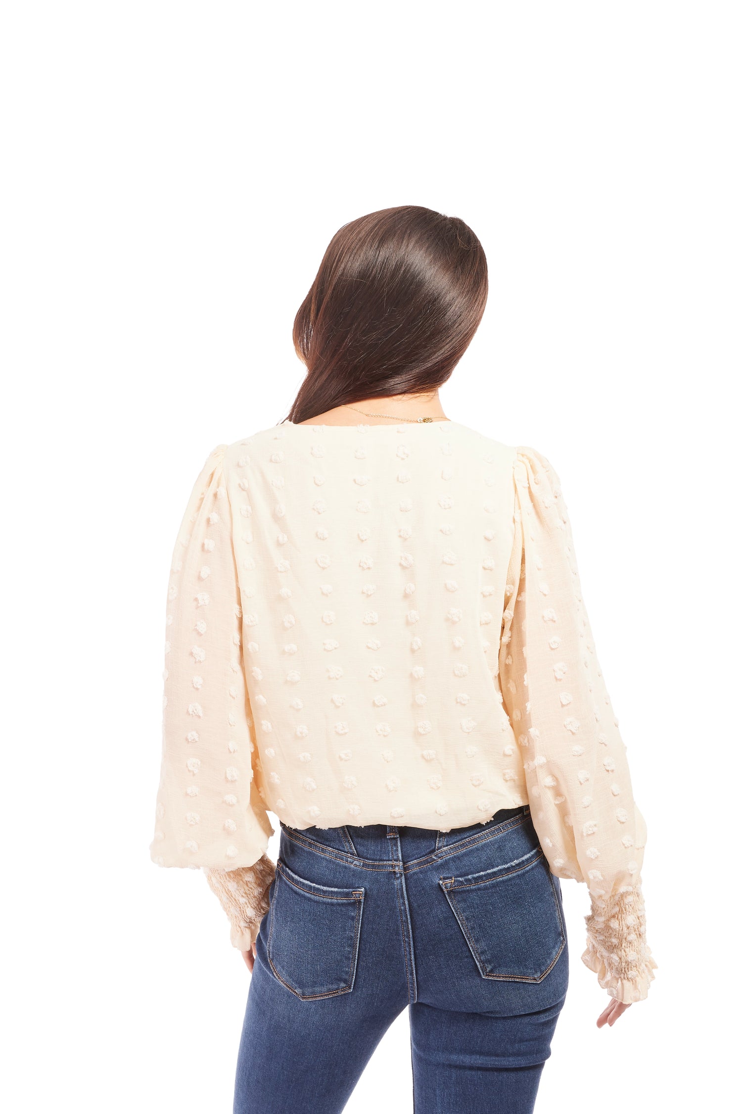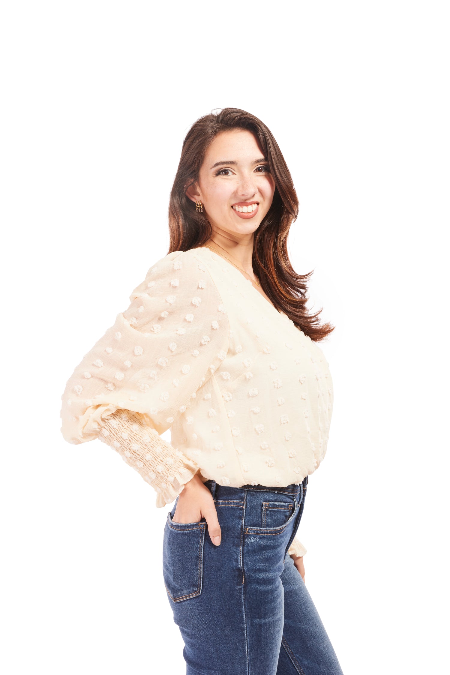 The Vibrant Rhythm Bodysuit by White Birch will give you the feeling of jamming out to your favorite song. It features smocked long sleeves with a ruffle, contrasting swiss dots, and a functional snap button. Pair with your favorite denim and boots.
