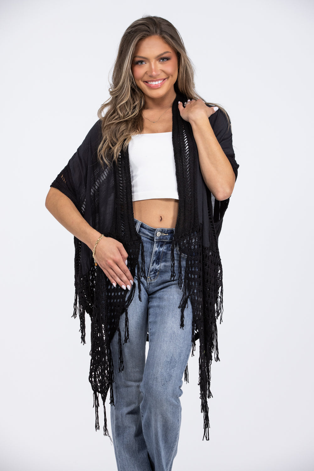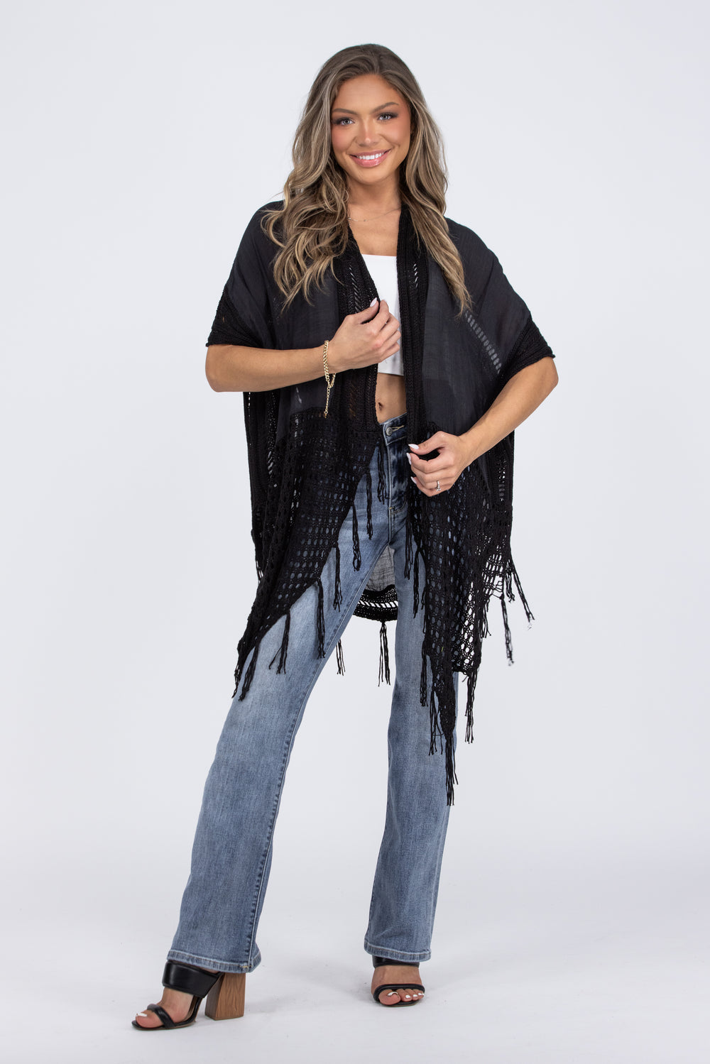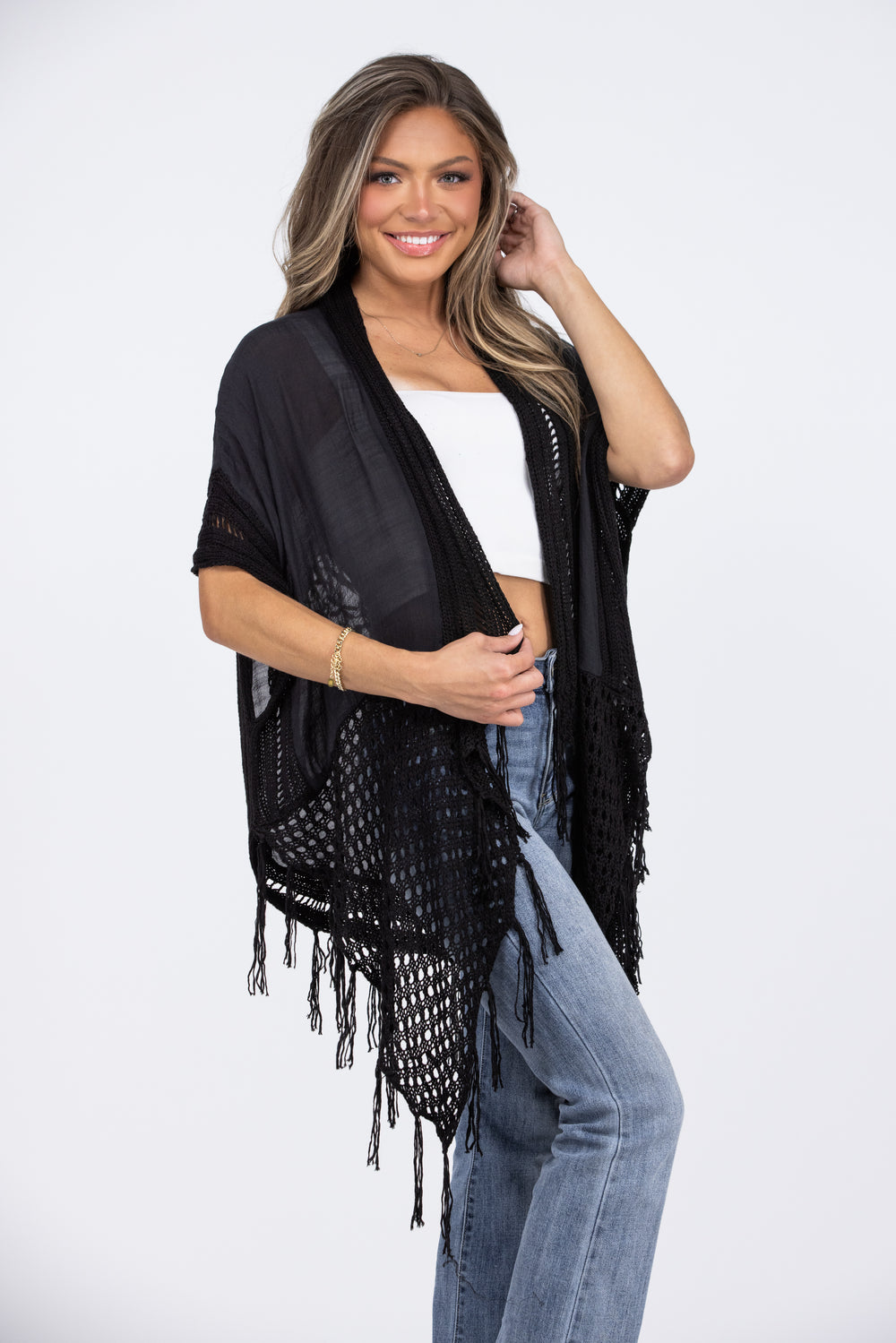 The Waiting On This Moment Kimono by Miracle will be the perfect add on to any outfit! This kimono features a lace back, fringe hem, short sleeves, and a contrasting knit. You can pair this kimono with any of your favorite outfits!