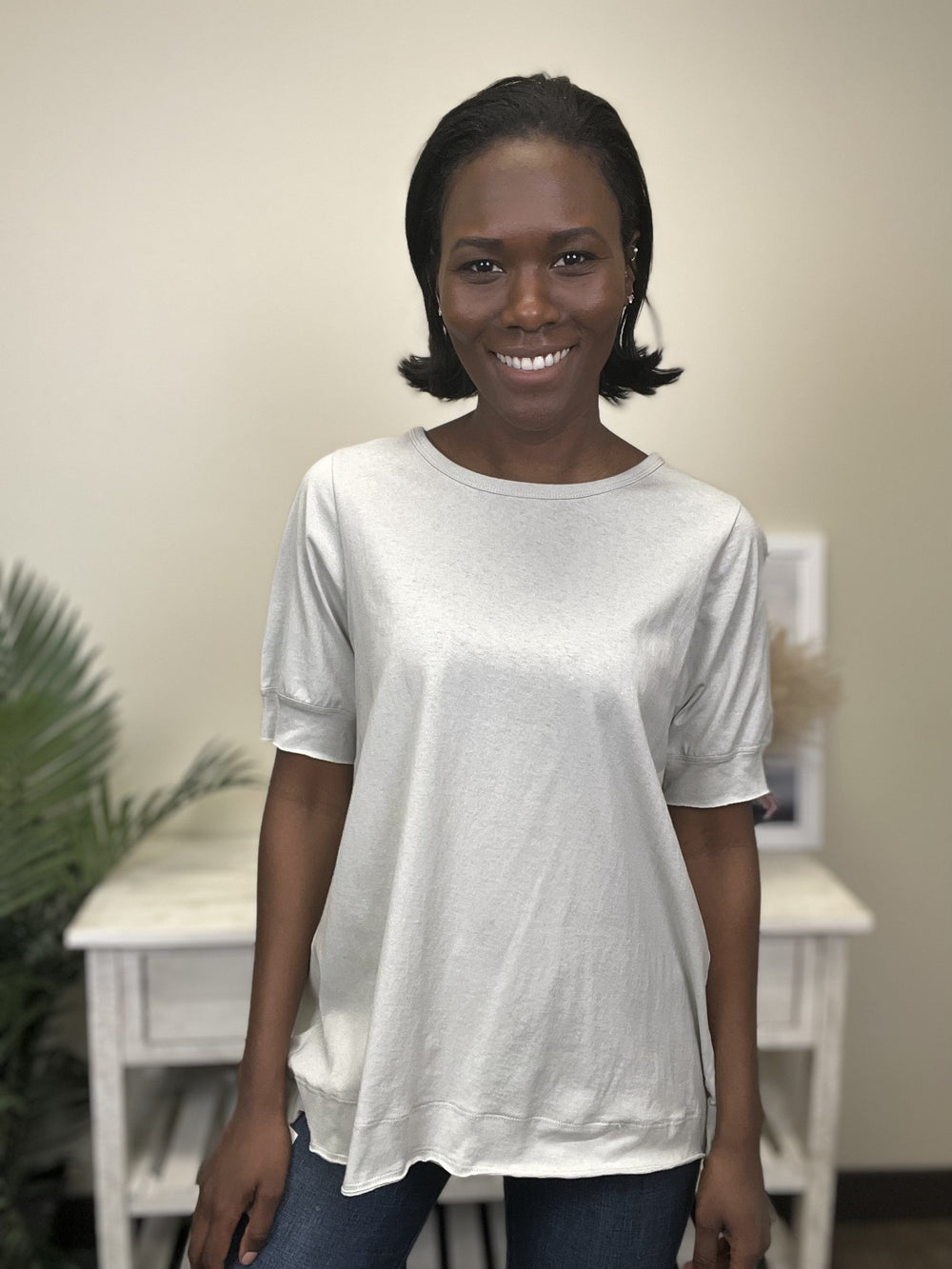 The Walk Softly Top by Cotton Bleu is an Open Back Detailed Top. Short sleeved with a rounded neckline, and a high-low hemline. Add rough cut edges to the sleeves and hem of the walk softly top, and this top is one of a kind. A perfect top to pair with leggings!