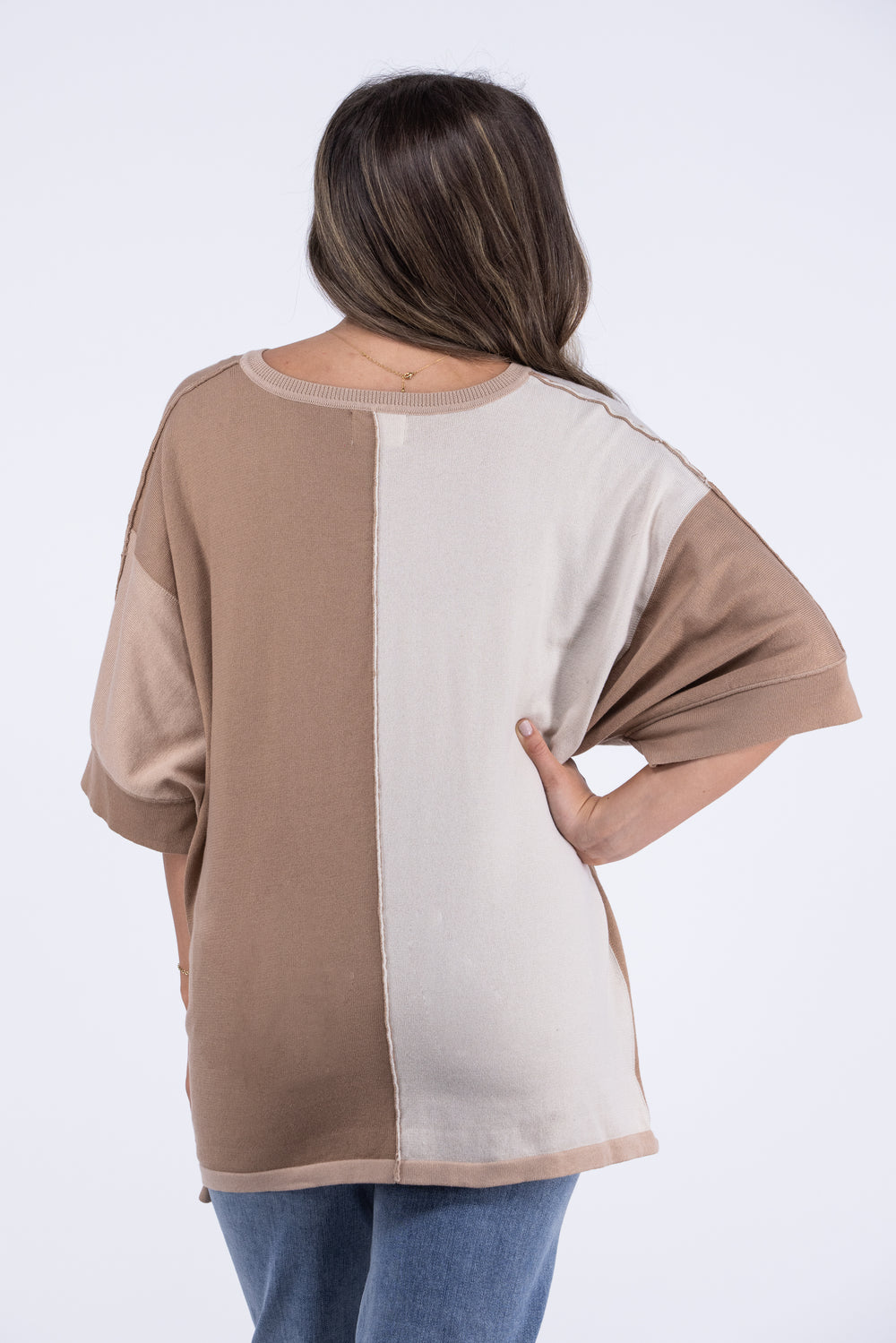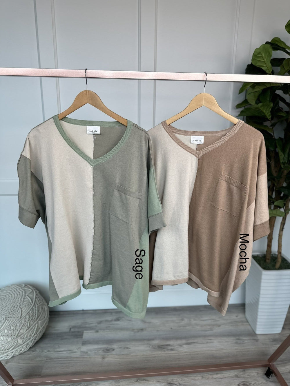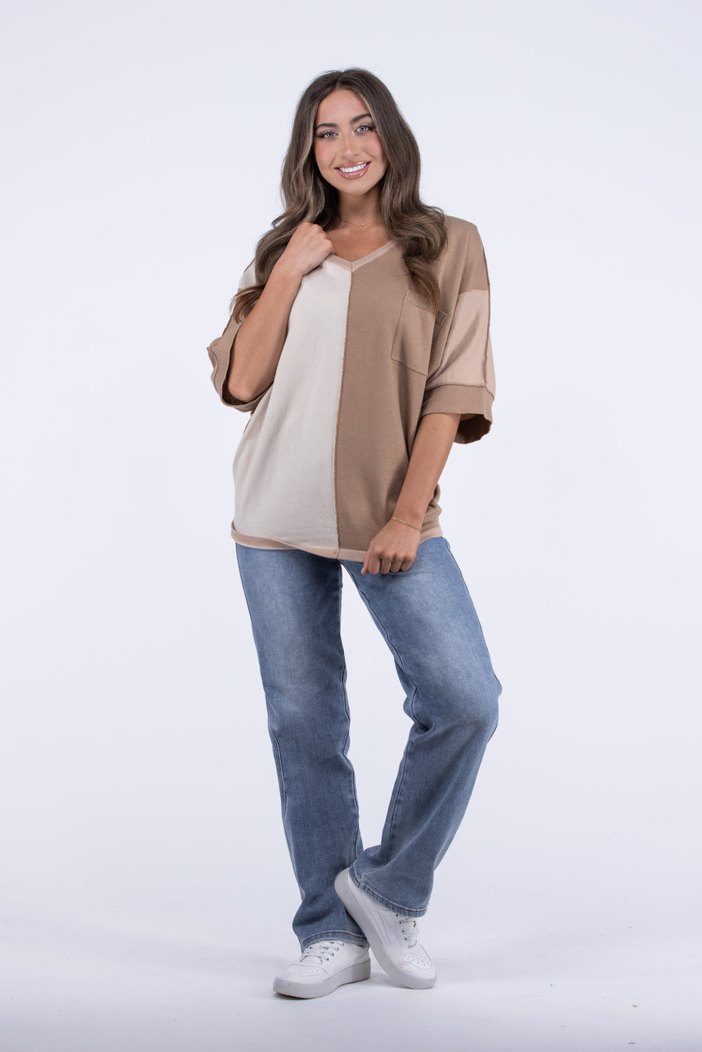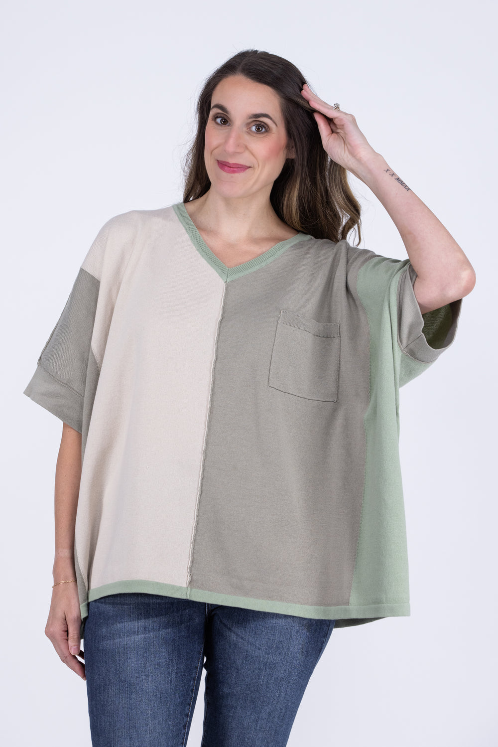 The Wandering Woods Top from Andree by Unit is perfect for a lunch date in town. It features contrast color blocks, a functional pocket, a V-neck, and an exposed seam detail vertically along the front. Pair with dark denim and booties for a day out with friends.