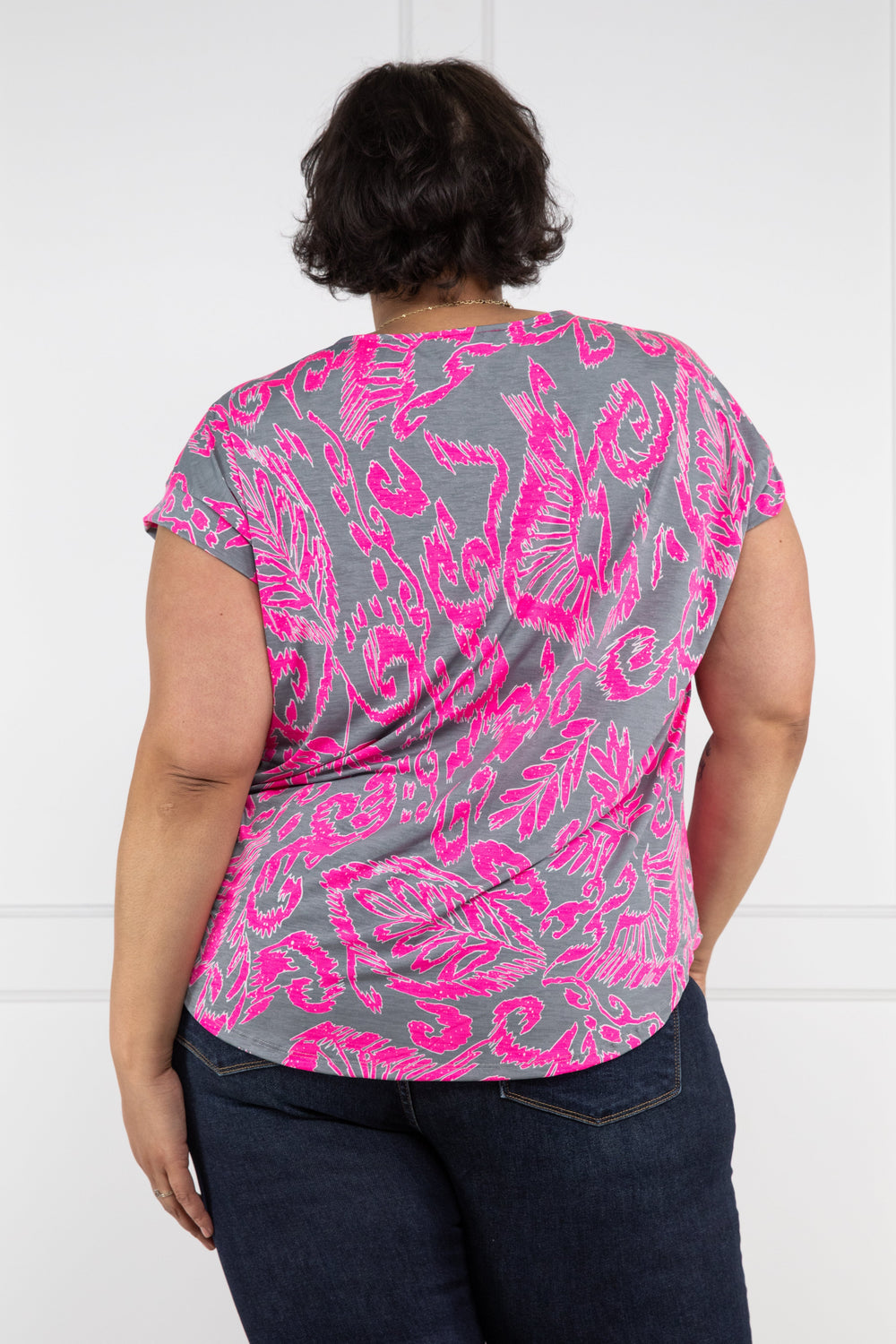 Model (mid-length dark brown hair) is a size 2XL, 46.5" bust, 36H bra size and is photographed in the size 1XL!