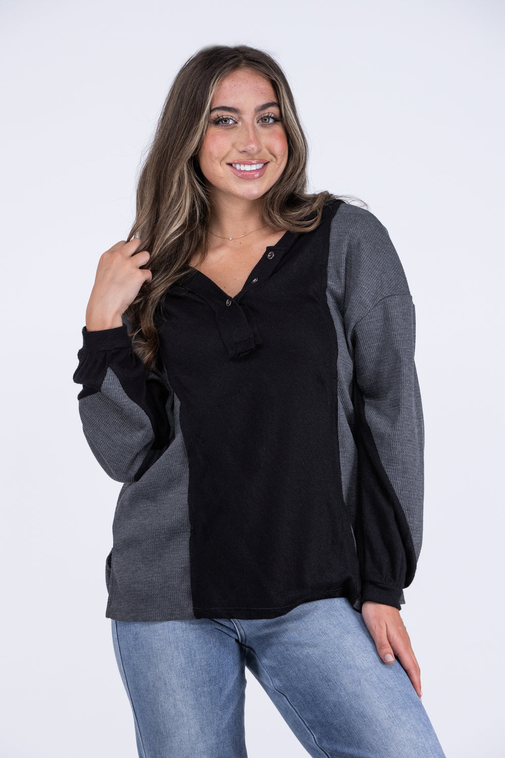 Elevate your style with The Warm Comfort Hoodie from Andree by Unit. This ultra trendy number is a mix media hoodie knit top with hoodie detail and button closure on front. We love the bubble sleeves with oversized fit. Easy, flowy, ready for transitional weather in this cozy knit material. Pair with your favorite leggings and fuzzy boots for a laid back and cozy outfit.