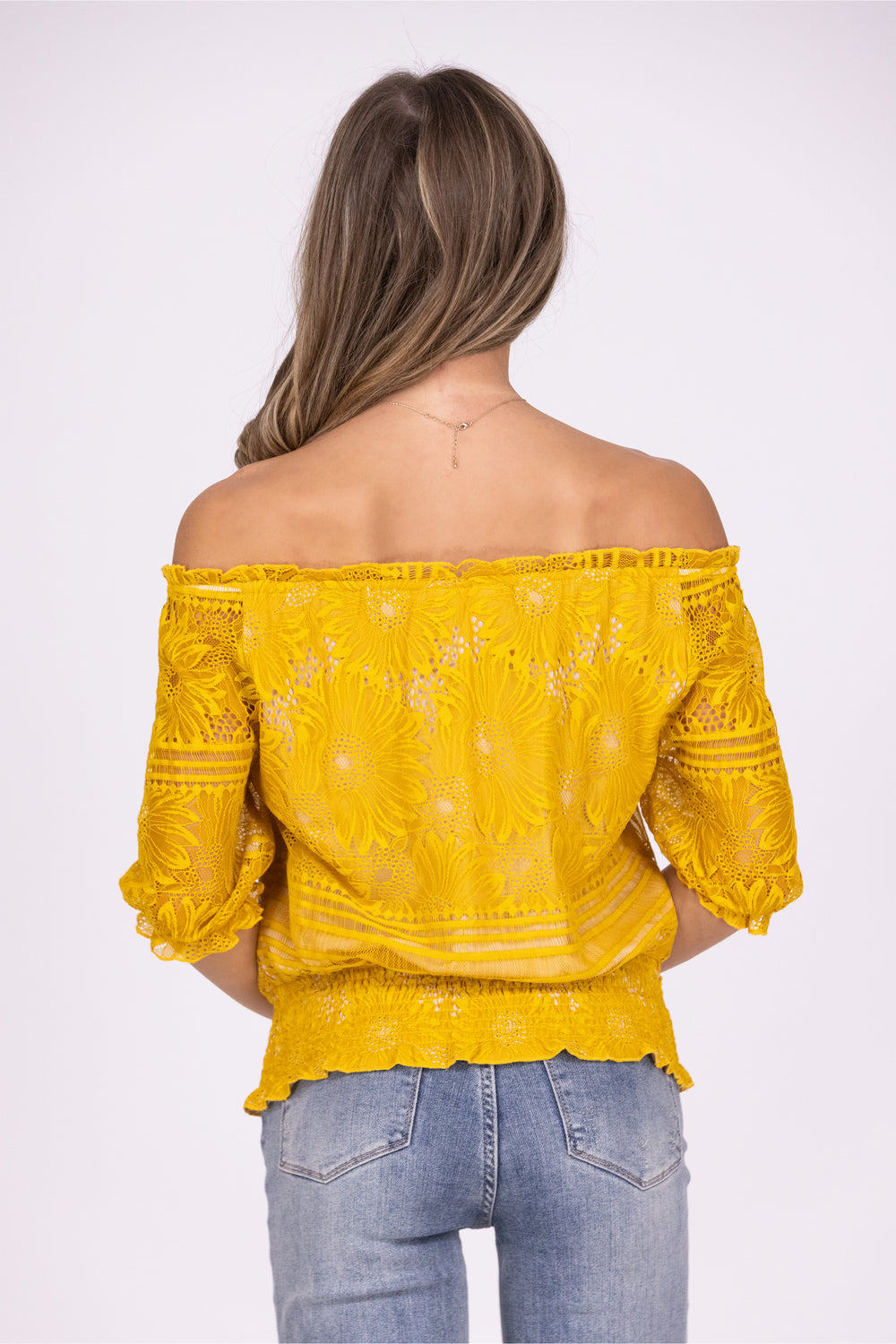 Stay cozy and stylish with our Warm in the Sunshine top from Mystree. This off the shoulder design features lace floral details and a smocked bottom. Perfect for soaking up the sun while staying warm.