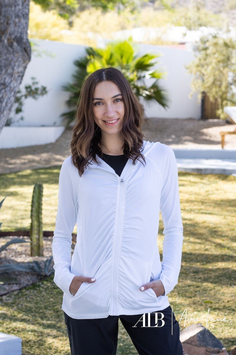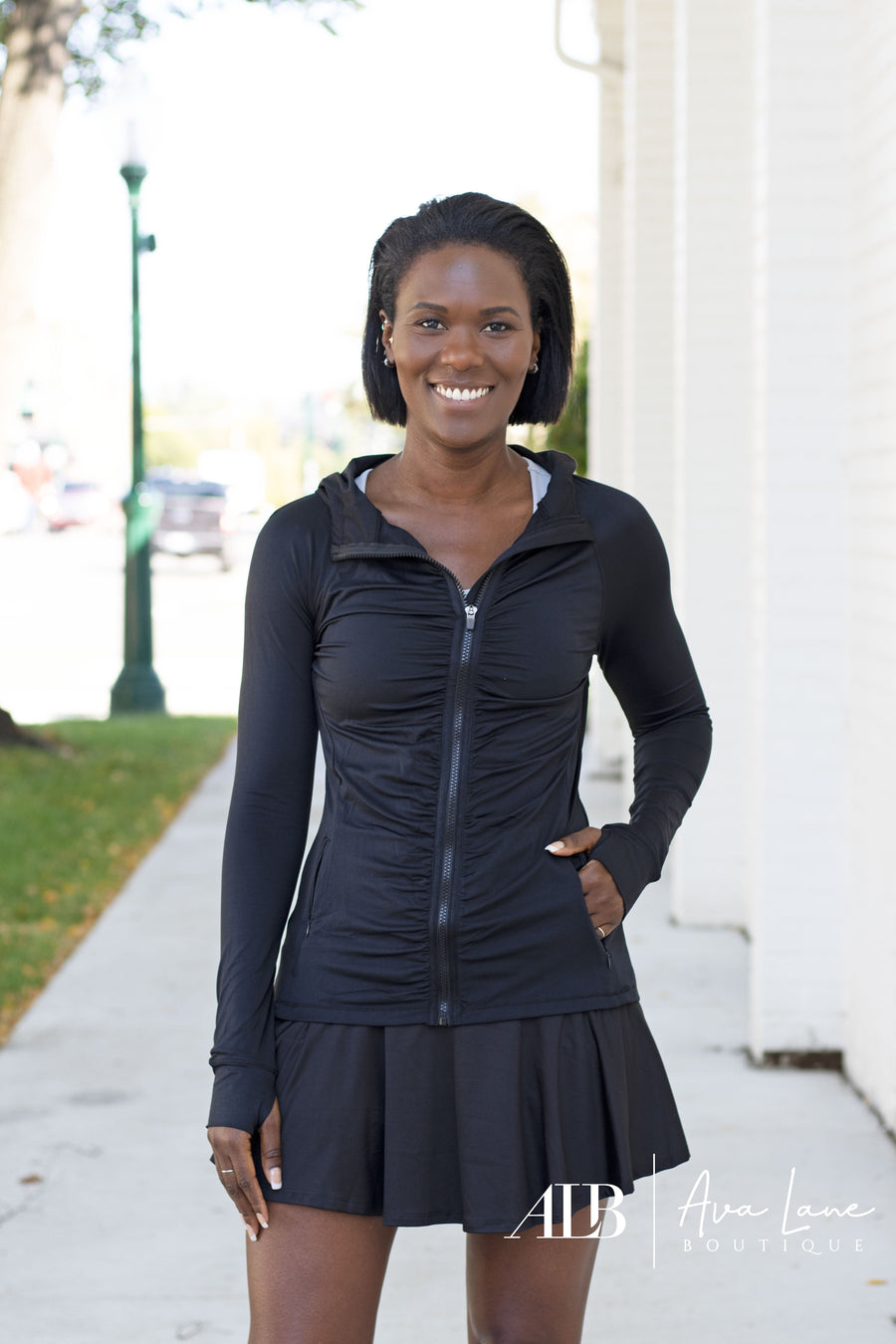 The Warm Up Hoodie by Mono B will be your next favorite activewear! This friendly hoodie jacket was constructed from recycled polyester and Lycra. The long sleeves have thumb holes to keep your wrists and palms warm, slanted zippered pockets, and a gathered accent on the zippered front that accentuates the curves. Moisture wicking- Four-way stretch. Pair with any of your favorite activewear bottoms and tennies for the perfect outfit!
