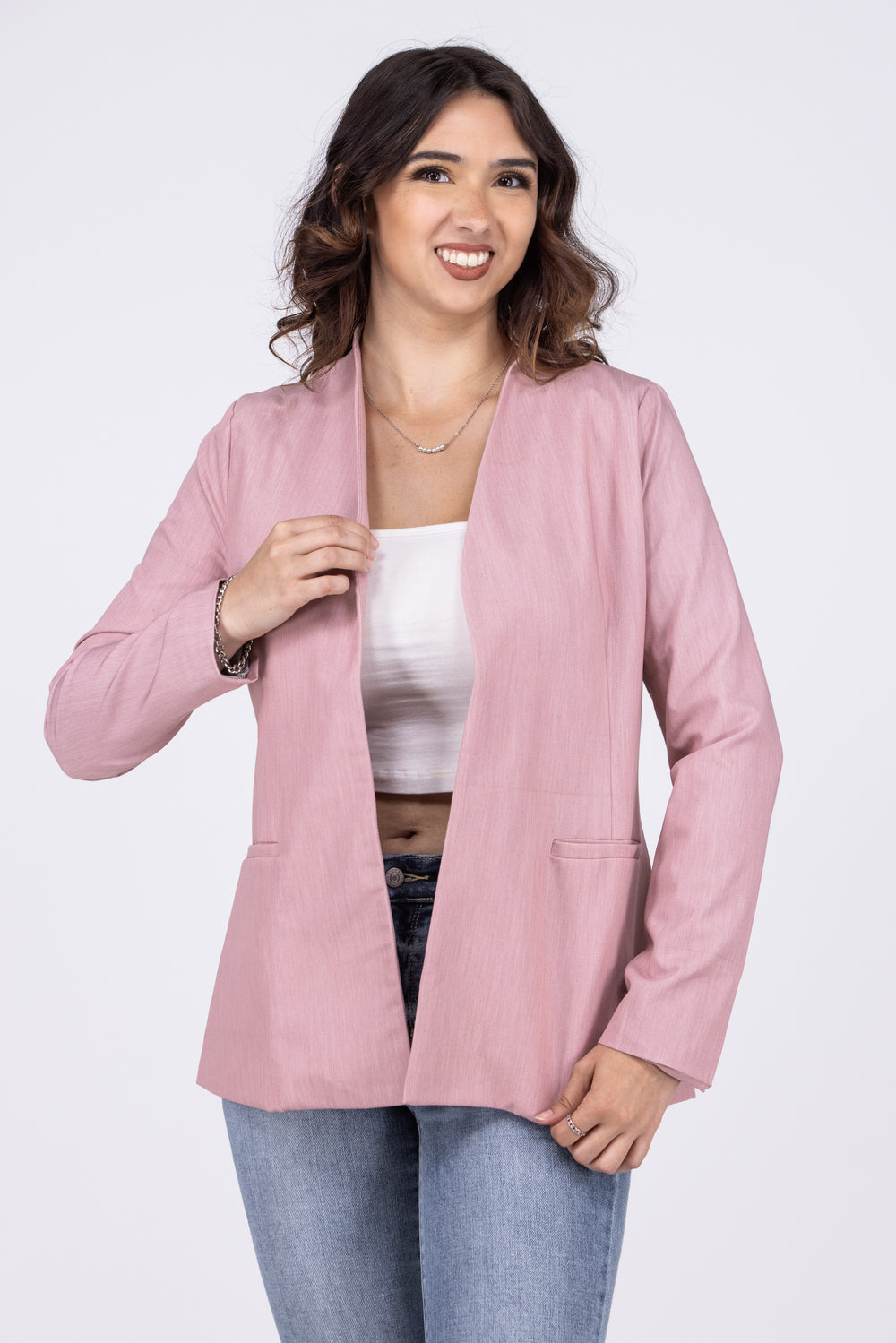 The Well Suited Jacket By Doe & Rae is a herringbone blazer jacket. It features a collarless neckline, long sleeves and pockets. This blazer can add a pop to your casual outfit or it's also perfect for work!
