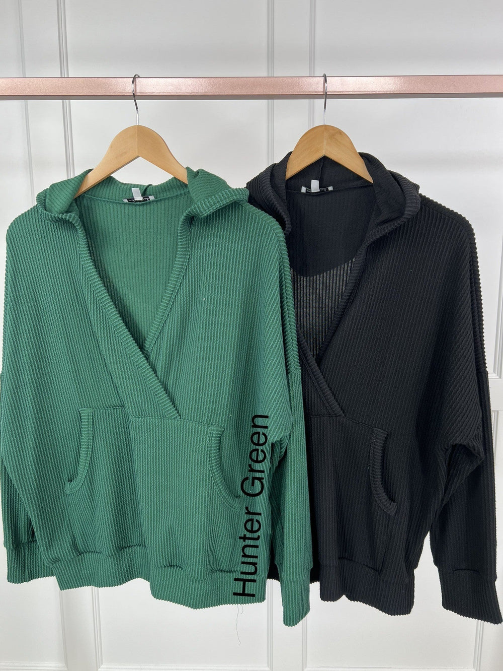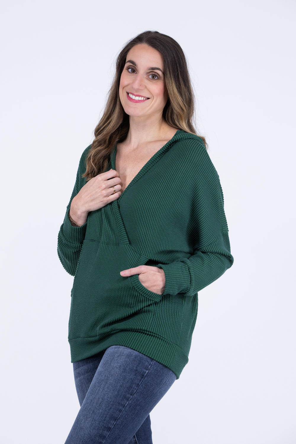 Why not purchase this cozy hoodie? The Why Not Corded Hoodie from White Birch is a soft corded ribbed knit top. It features long sleeves, hooded surplice neckline, front pouch pocket, banded hemline and a loose fit. Pair with your favorite lounge shorts to lounge around the house or head out with leggings and sneakers for a daily comfort laid back look.