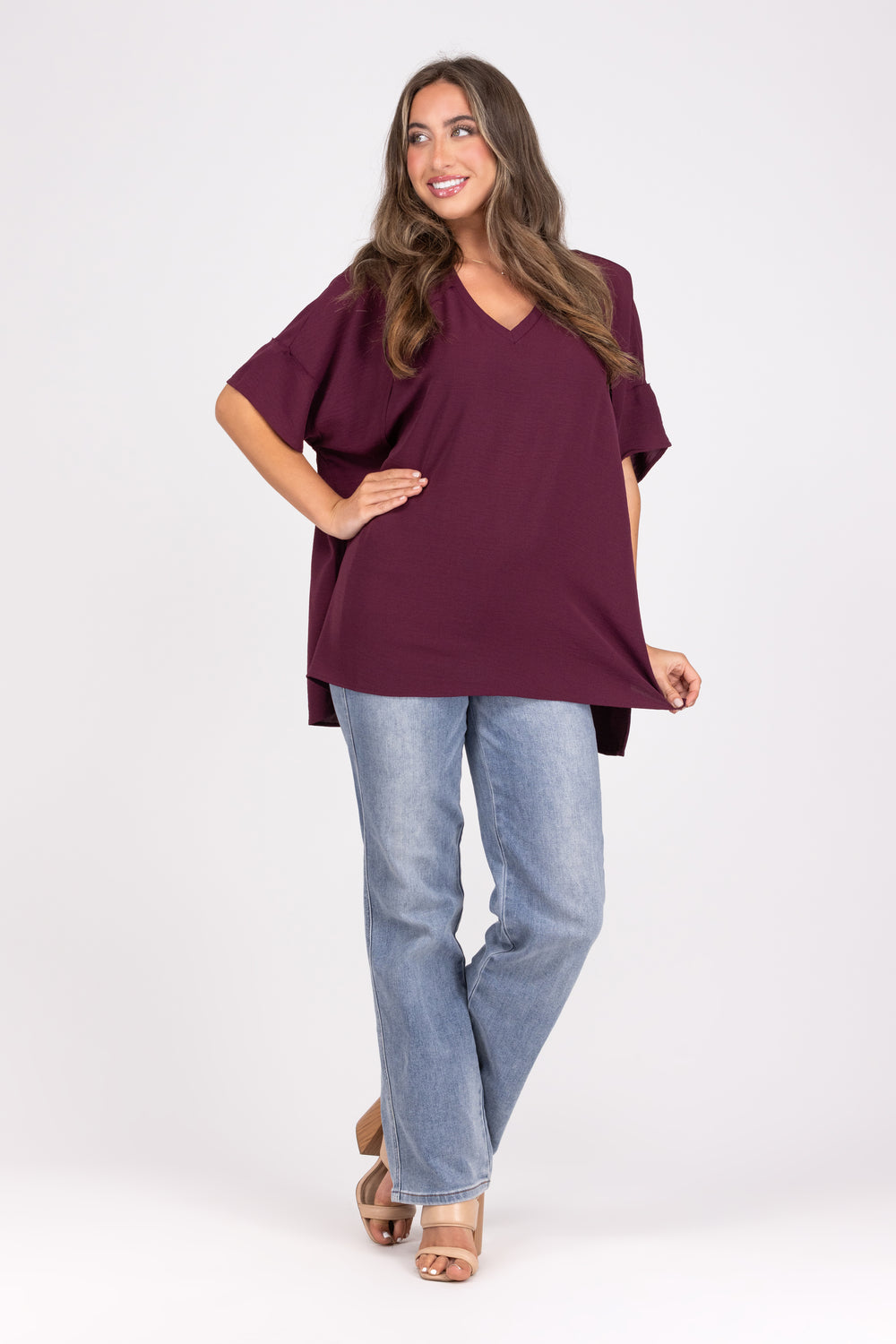 The With The Wind Top by Cotton Bleu is a lovely casual top. It features a V-neckline, raw edge details, a slight high low straight hemline, and flattering side slits. This is shirt you can wear everyday and everywhere!
