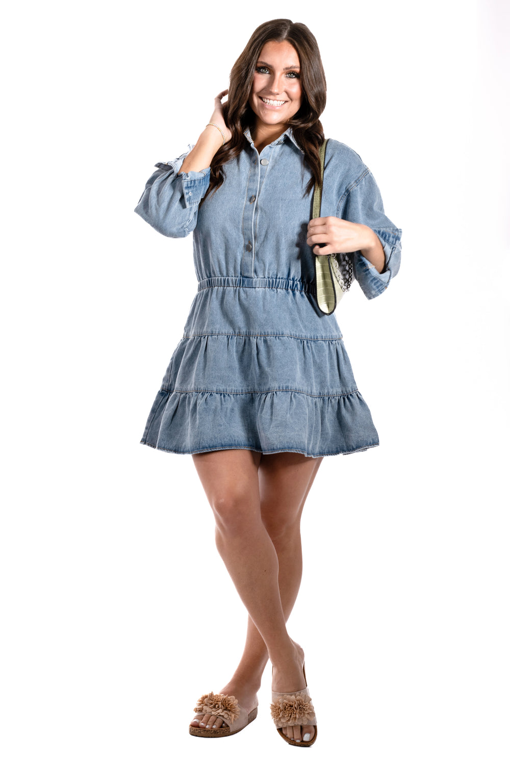 This denim dress is an instant classic! Featuring a collared neckline, elastic waistband, and button cuffs, this tiered dress is both stylish and comfortable. Perfect for any occasion, from casual outings or dress it up, this dress will elevate your wardrobe and showcase your unique sense of style.