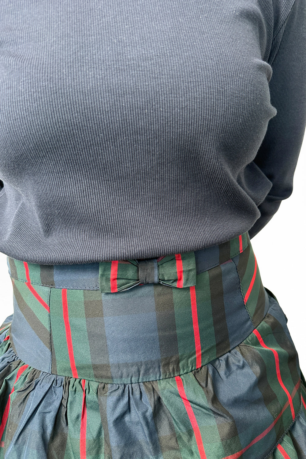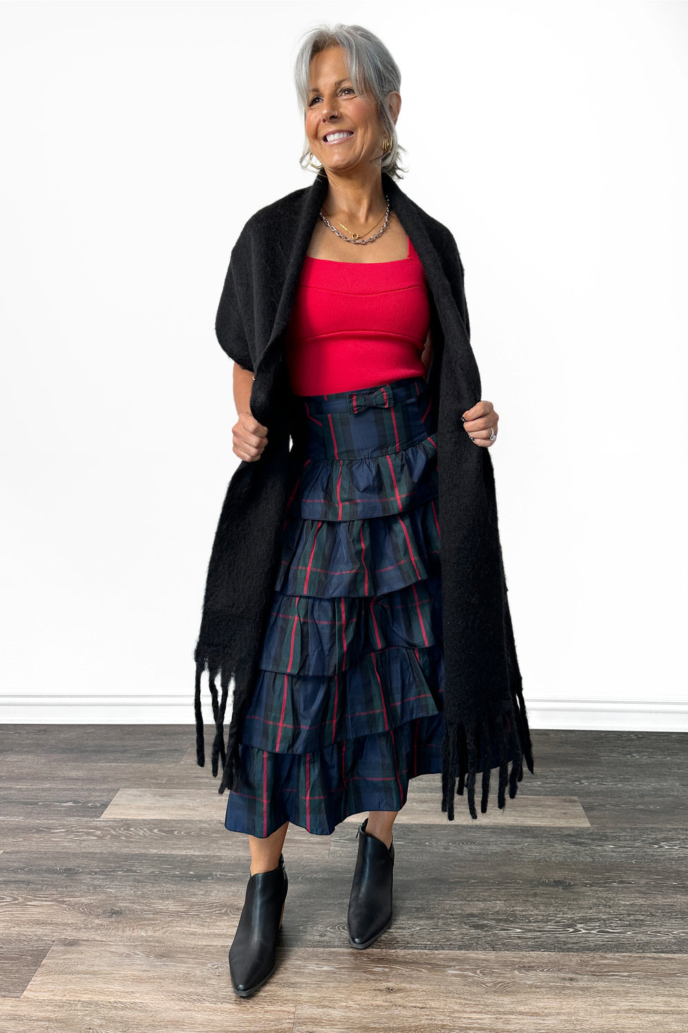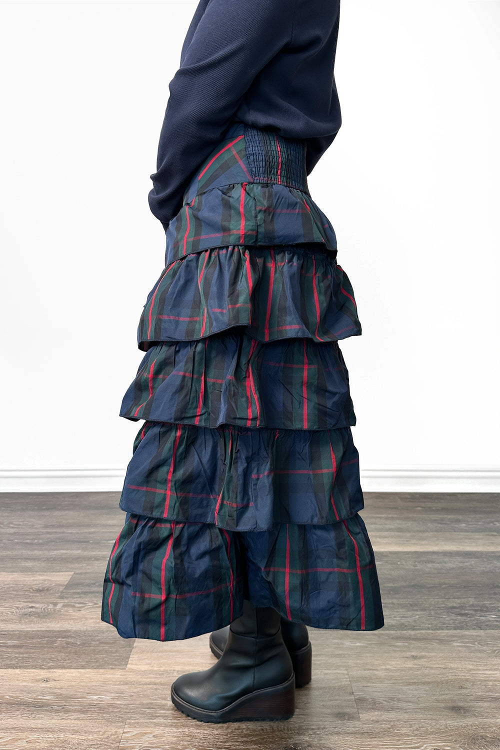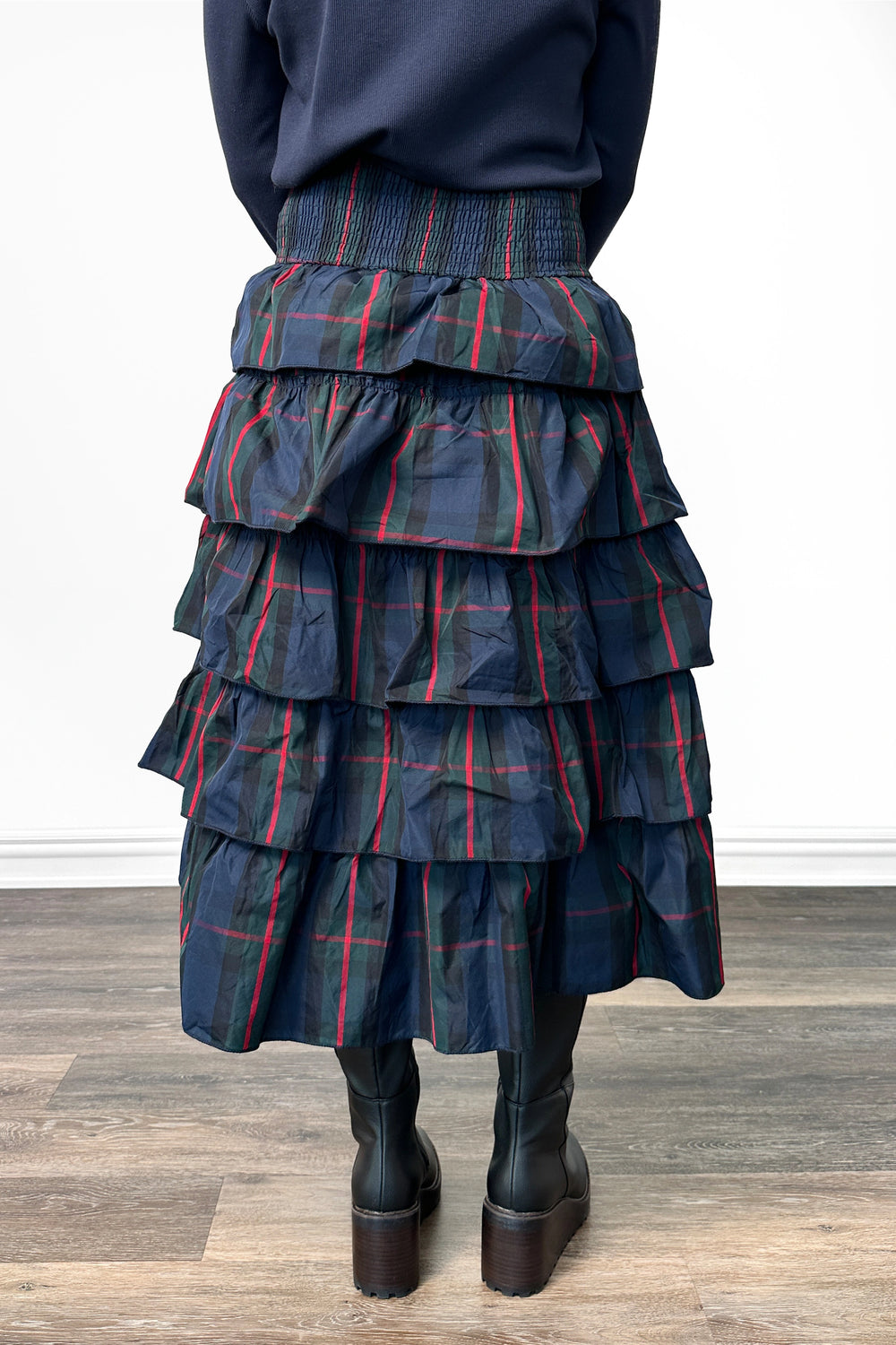 The Women's Plaid Tiered Ruffle Skirt by Heyson offers a refined blend of classic pattern and elegant design. With a checked pattern and tiered ruffles to create a dynamic silhouette, this high-waisted, flared mid-length skirt is flattering for all bodies. The lightweight fabric and elastic back waistband ensures comfort without compromising on style. The bow detail at the front adds a polished touch, making this skirt perfect for sophisticated wardrobes.