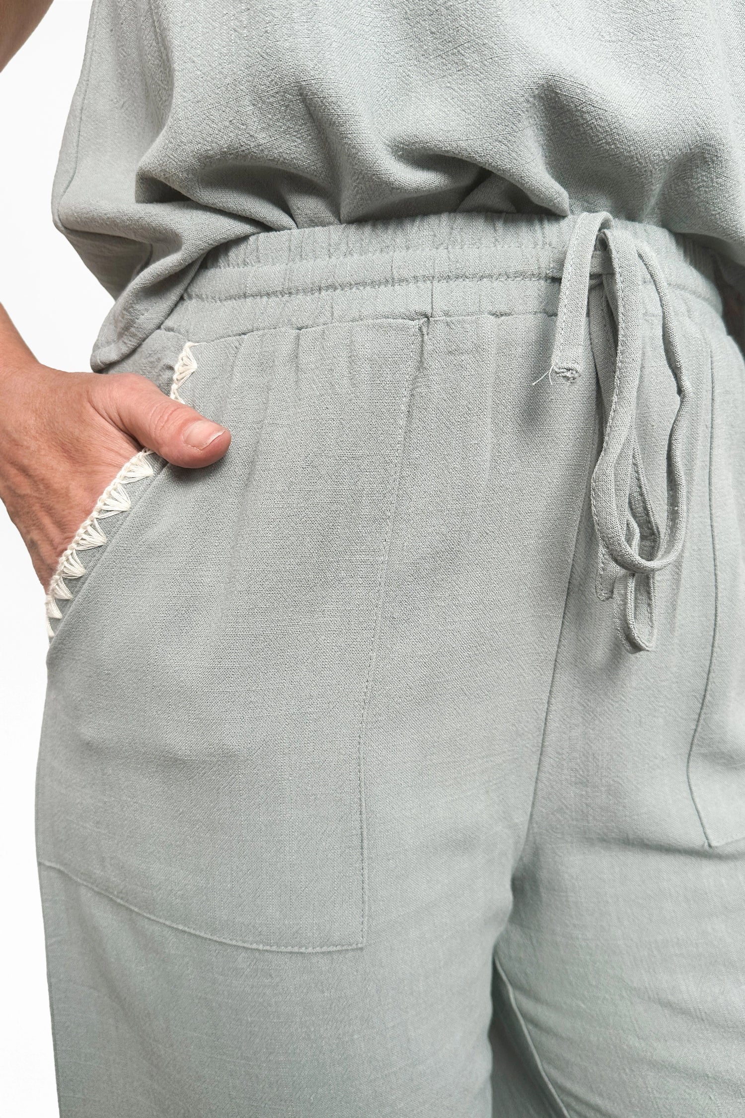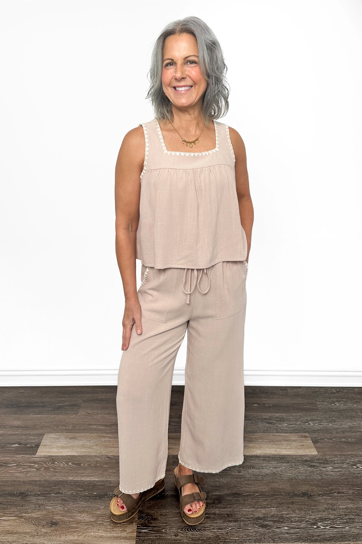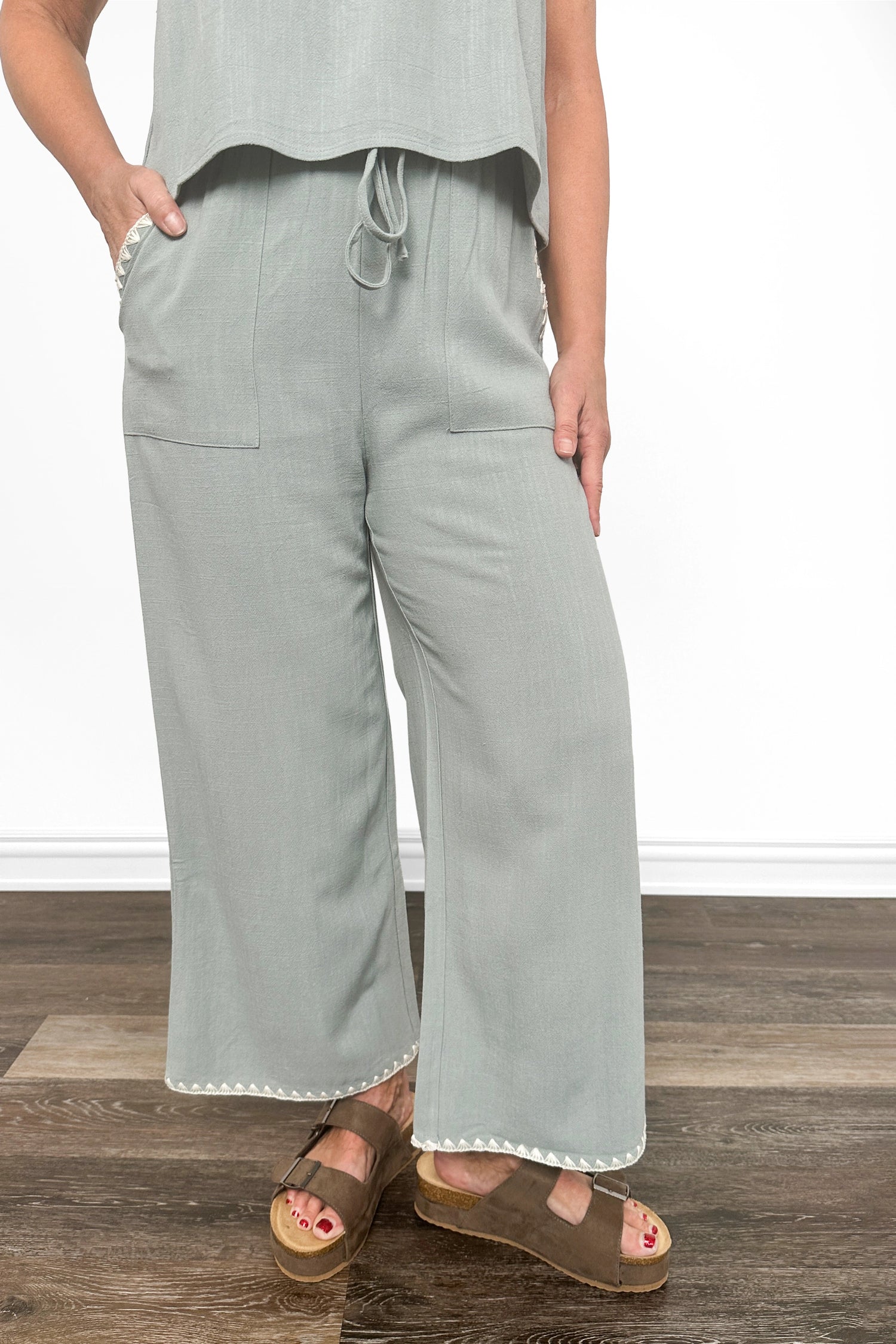 Experience effortless style with these Women's Embroidered Linen Blend Ankle Pants by Allie Rose. The embroidery adorning the hem adds a finishing touch that sets these pants apart. An adjustable elastic tie waist provides all-day comfort and a customizable fit, while strategically placed deep pockets offer practical storage for your daily essentials. Made from lightweight linen, these ankle pants breathe beautifully in warm weather and work beautifully with everything from casual tees to polished blouses. Invest in a piece that combines timeless style with everyday functionality.