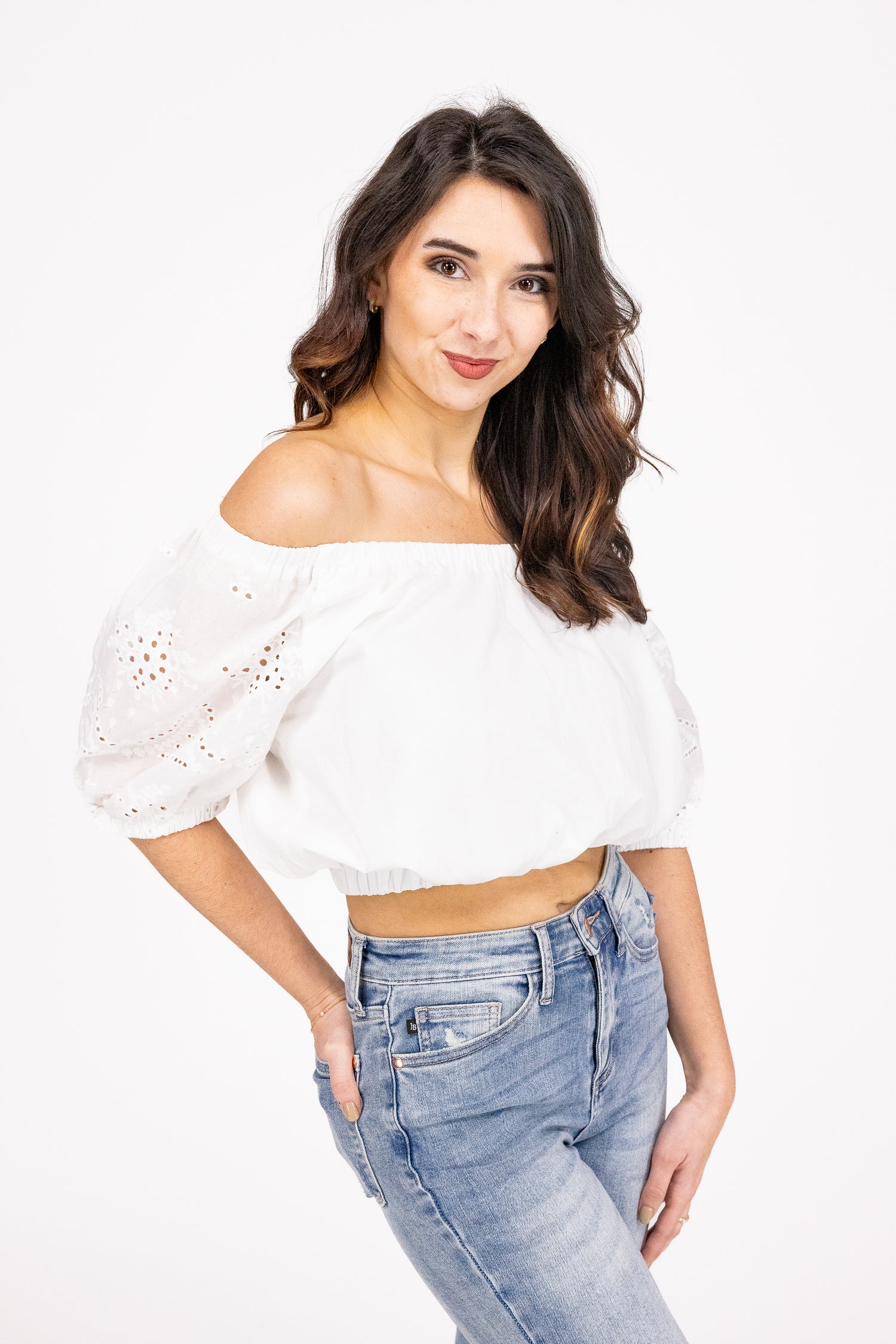 Add some flirty fun to your wardrobe with our Women's Eyelet Detail Off The Shoulder Top from White Birch. A solid knit top with stylish eyelet sleeves and an off the shoulder elastic neckline, this top offers a relaxed and playful fit.