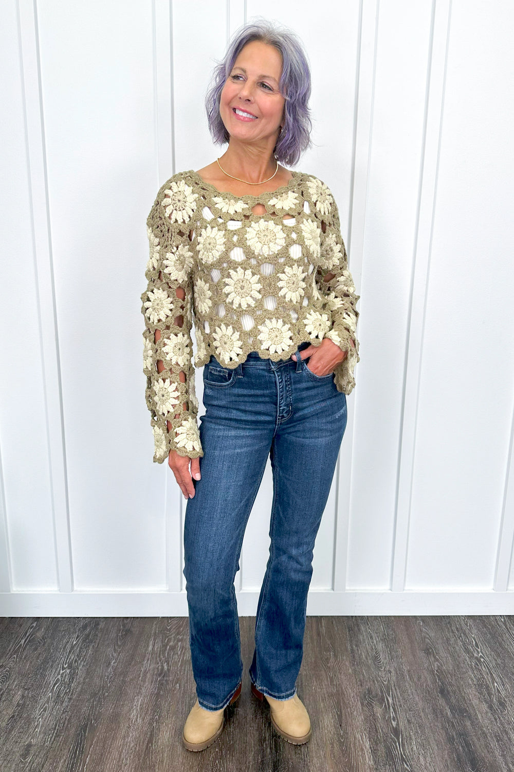 Add a feminine touch to your wardrobe with this Women's Floral Crochet Scalloped Edge Top from Storia. Featuring a charming daisy floral pattern, scalloped cropped hem, and a flattering round neckline, this long-sleeve piece is perfect for layering over your favorite tops, tanks, and bralettes to create effortlessly fun looks.
