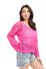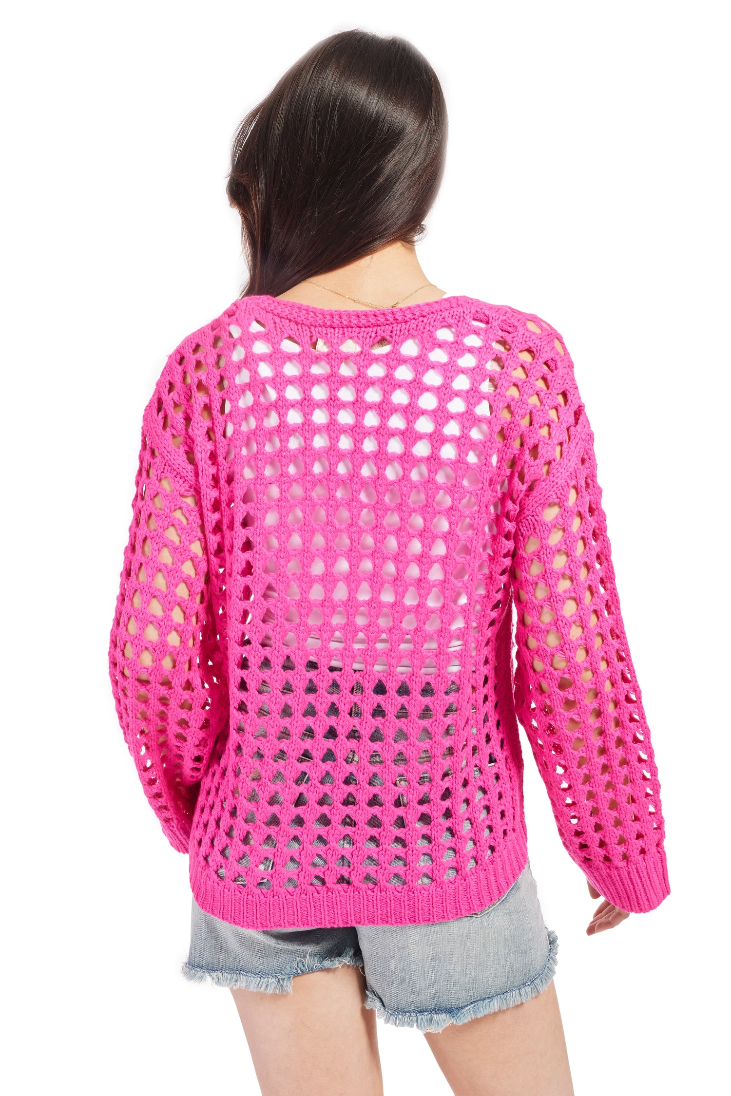 This fuchsia open knit sweater is the perfect addition to any stylish woman's wardrobe. Made with open knit material, it is lightweight and comfortable. Perfect to pair over your favorite bralette or tank!
