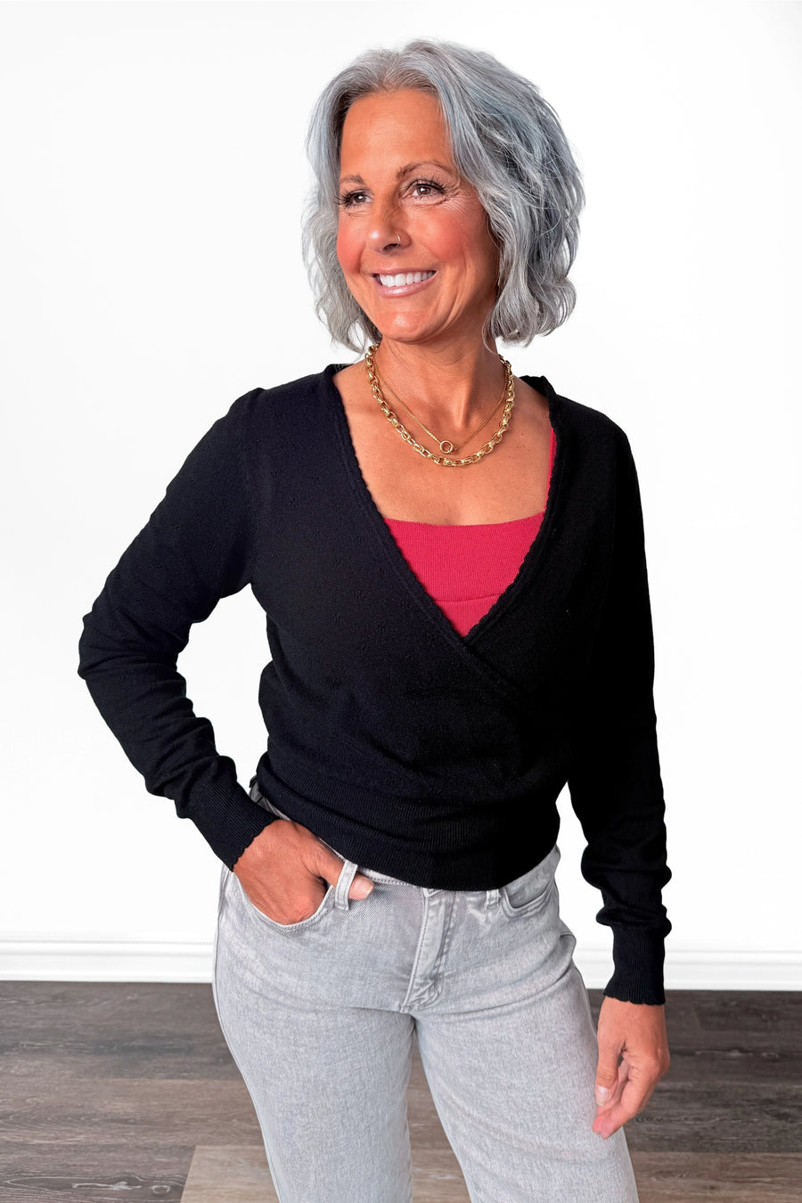 The Women's Pointelle Scallop Trim Cross-Over Sweater by Allie Rose features a fine gauge pointelle knit that offers a delicate texture. Its scallop-trimmed V-shaped neckline adds a touch of sophistication, while the front cross-over design creates a flattering silhouette while ribbed cuffs and hem provide a polished finish and comfortable fit. This sweater combines elegant detailing with comfortable wear, perfect for a refined look making it an ideal choice for those seeking timeless style infused with subtle, intricate detailing.