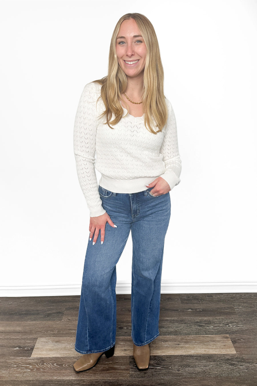 This Women's Pointelle Scallop V-Neck Sweater by Allie Rose is the epitome of understated elegance. The fine gauge pointelle knit delivers a soft, breathable feel against the skin, while the scalloped V-neckline adds a touch of feminine sophistication. Finished with ribbed cuffs and hem for structure and durability, this pullover sweater pairs effortlessly with tailored trousers or your favorite denim. A wardrobe essential that exudes quiet luxury and timeless appeal.