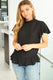 A short sleeve solid knit top with lining and a mock neck featuring a ruffled hemline and ruffled sleeve.