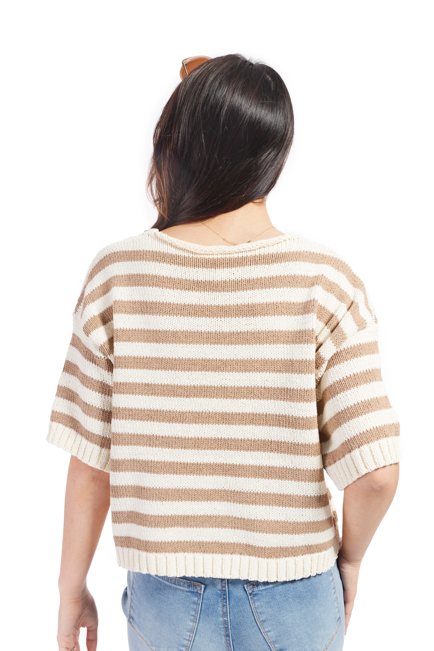 Women's Stripe Deep V-Neck Short Sleeve Knit Top- Mocha