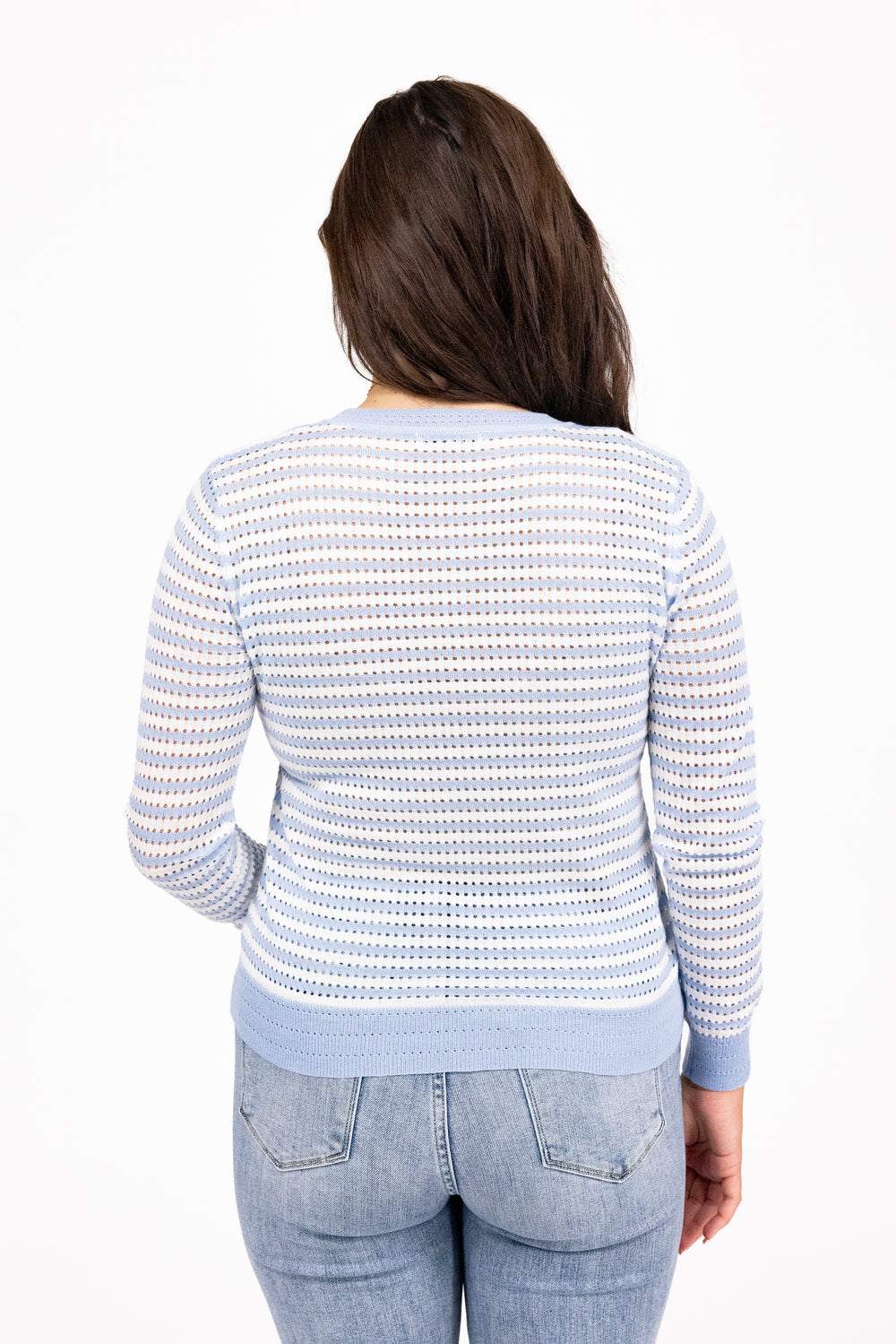 This Women's Stripe Open Knit Sweater from Staccato is the perfect finishing touch to any casual outfit! With it's open knit pattern, layer over your favorite tank top or bralette for added style and comfort. This crewneck sweater also features a stripe pattern with a textured hem and sleeve cuffs. Layer up your style by adding this open knit sweater to your wardrobe!