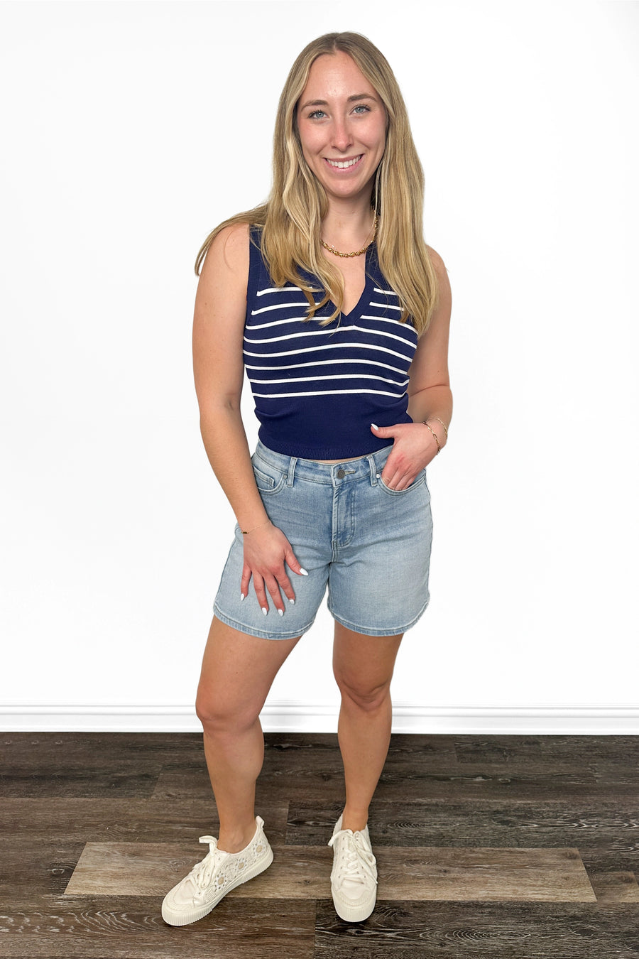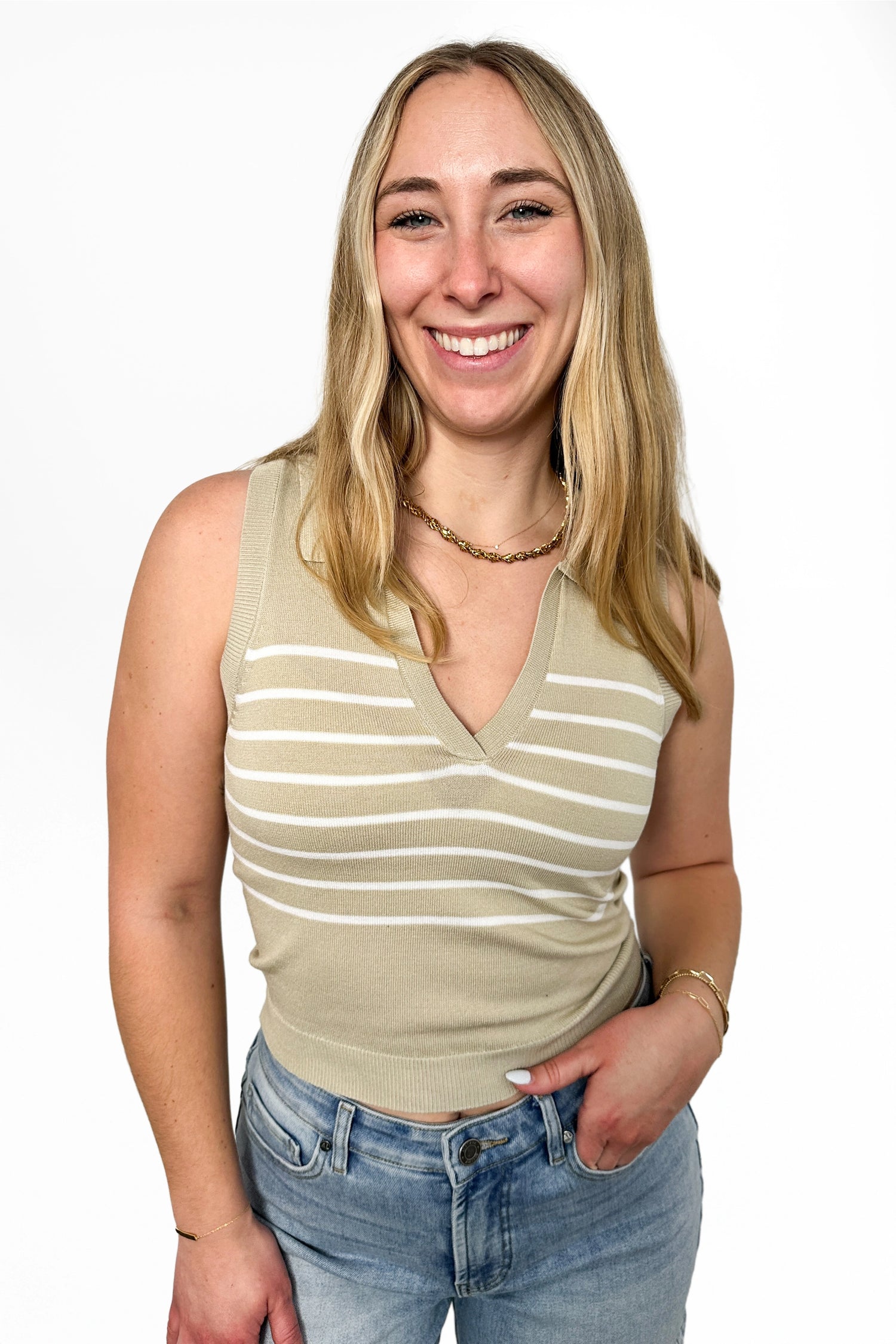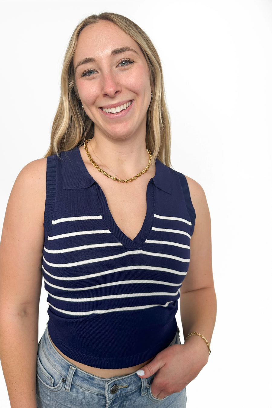 Invest in versatility with this Women's Striped Knit Polo Tank Top by Allie Rose. Designed with a sophisticated collared v-neckline and structured ribbed hemline, this tank becomes the backbone of countless outfits. Slip it under a crisp blazer for boardroom-ready polish, or layer it with a cozy cardigan for understated charm. The timeless striped pattern and quality knit construction ensure this piece remains a go-to favorite, delivering effortless style whether you're dressing for work or weekend adventures.
