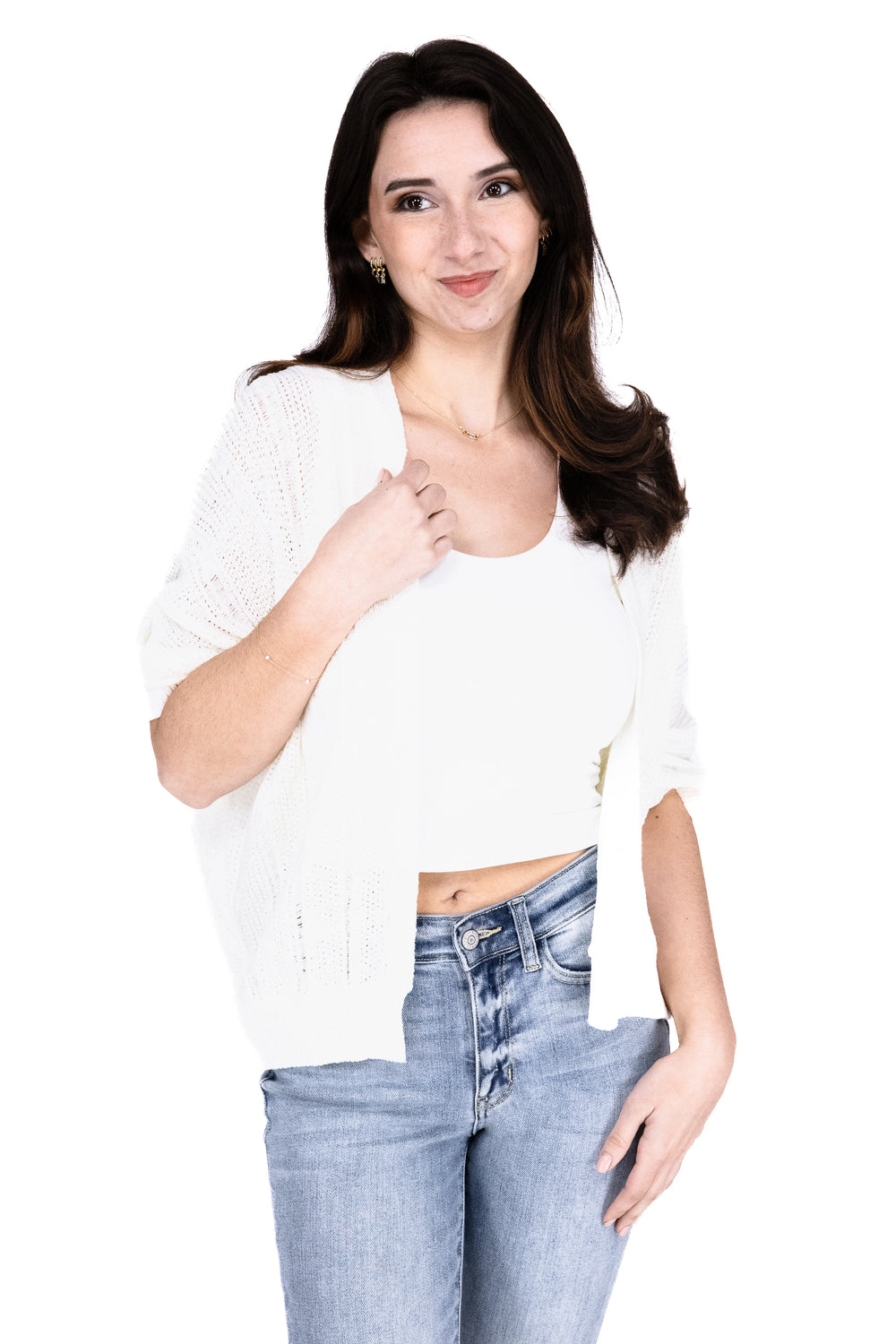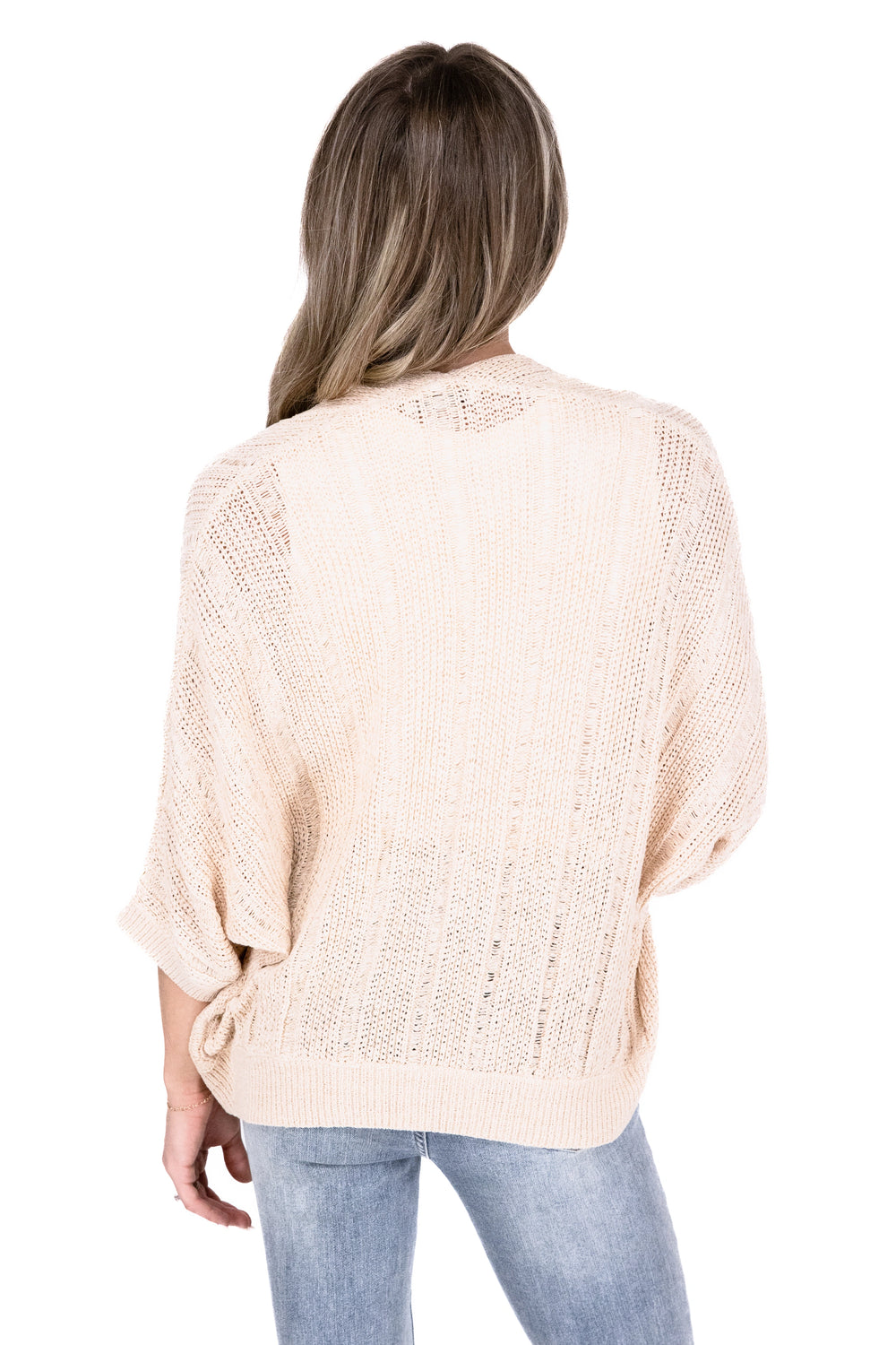 Elevate your wardrobe with this Textured 3/4 Sleeve Cardigan from Staccato! This cardigan features a pointelle texture, 3/4 kimono sleeves, and an open front. The ribbed texture on the cuffs and hem add to the stylish feel. Stay effortlessly stylish whether you're in the office or out to dinner with this cardigan!
