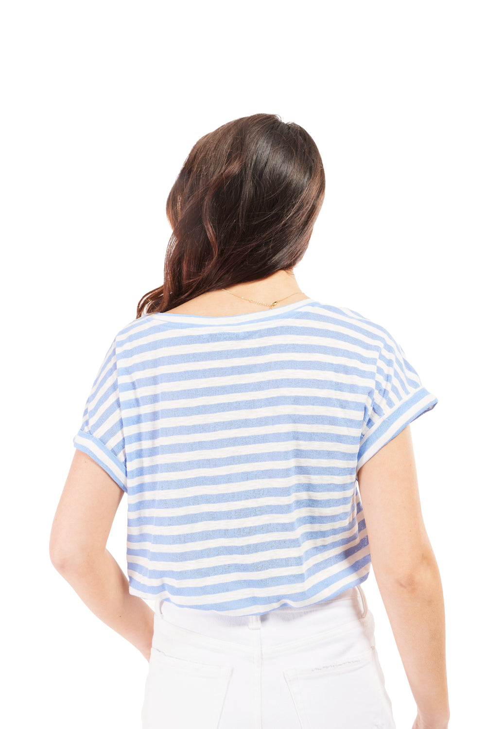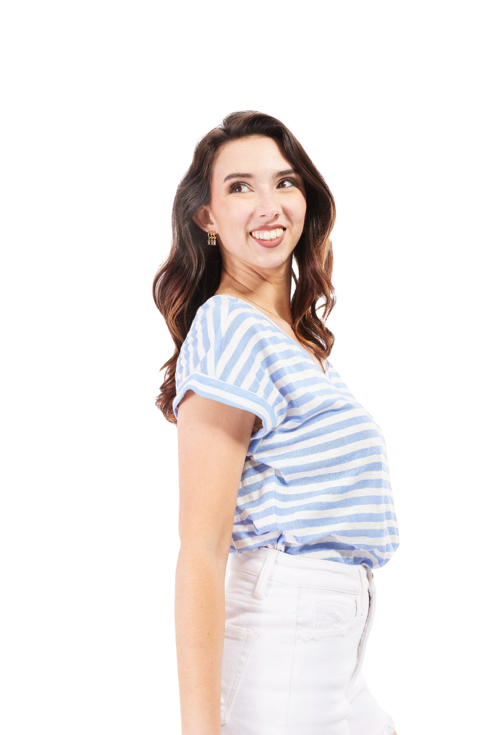 Get ready to turn heads with our Women's V Neck Striped Short Sleeve Top by Staccato! Featuring a flattering V-neck design and stylish striped knit fabric, this top is perfect for any occasion. Add it to your wardrobe today and elevate your style game!