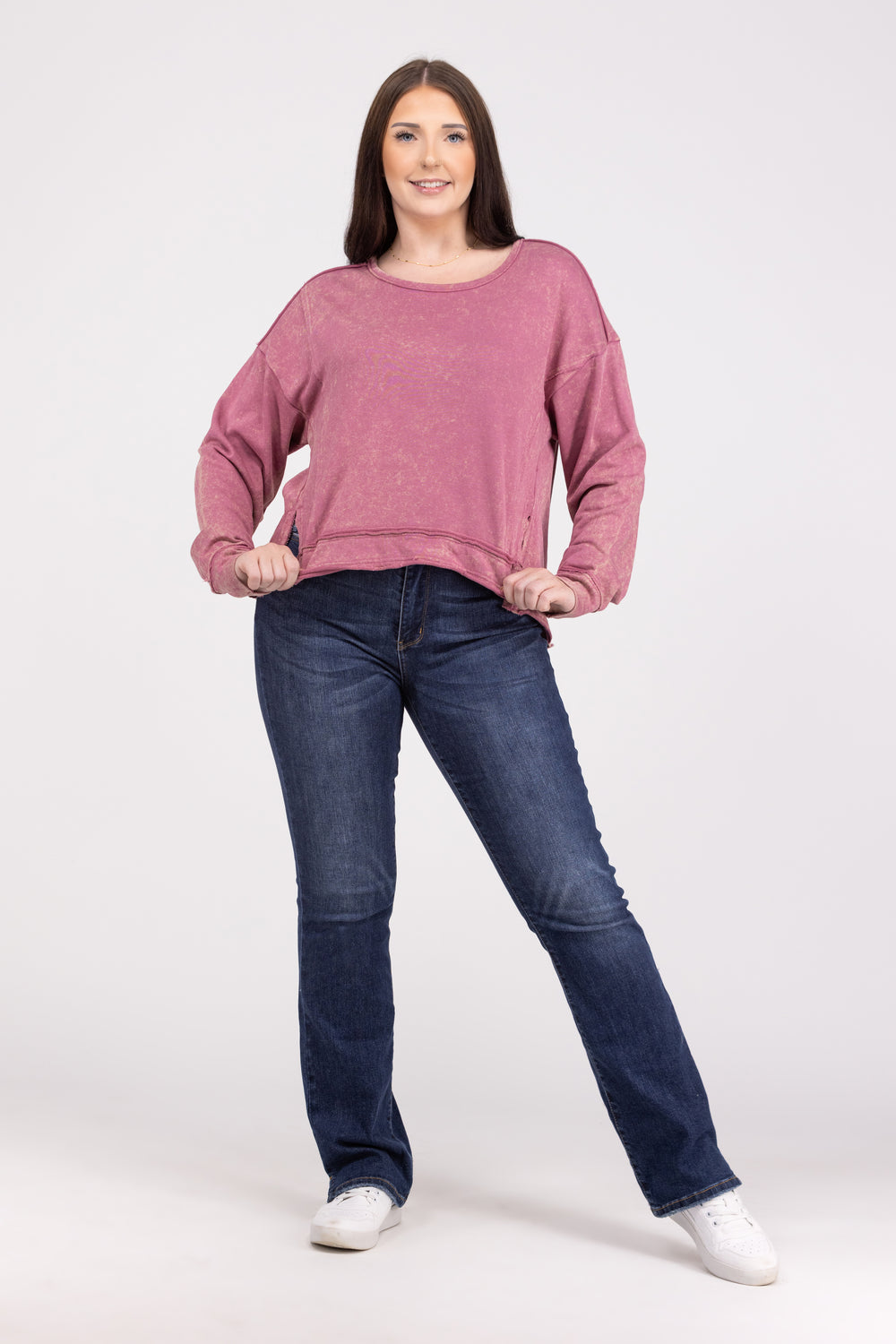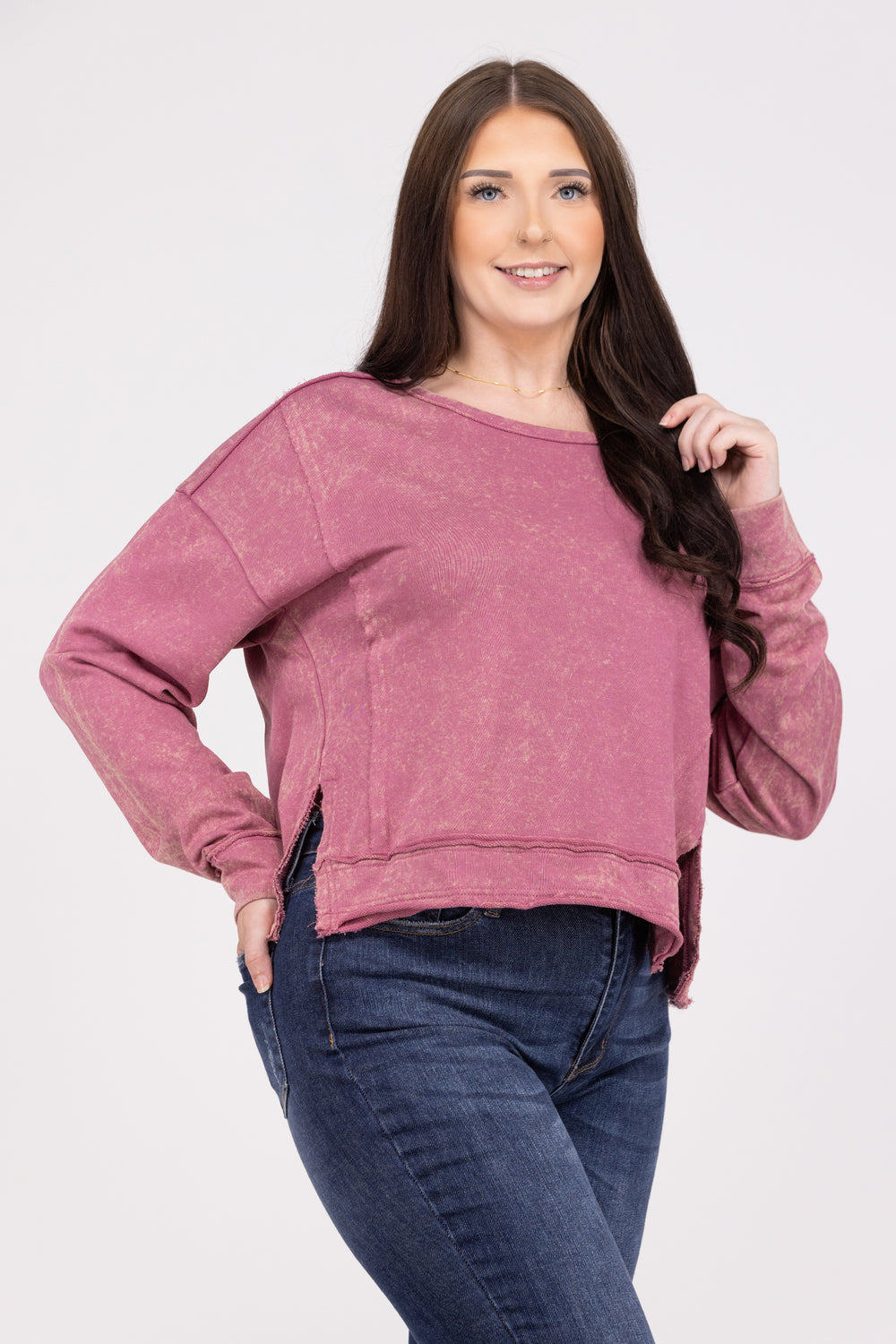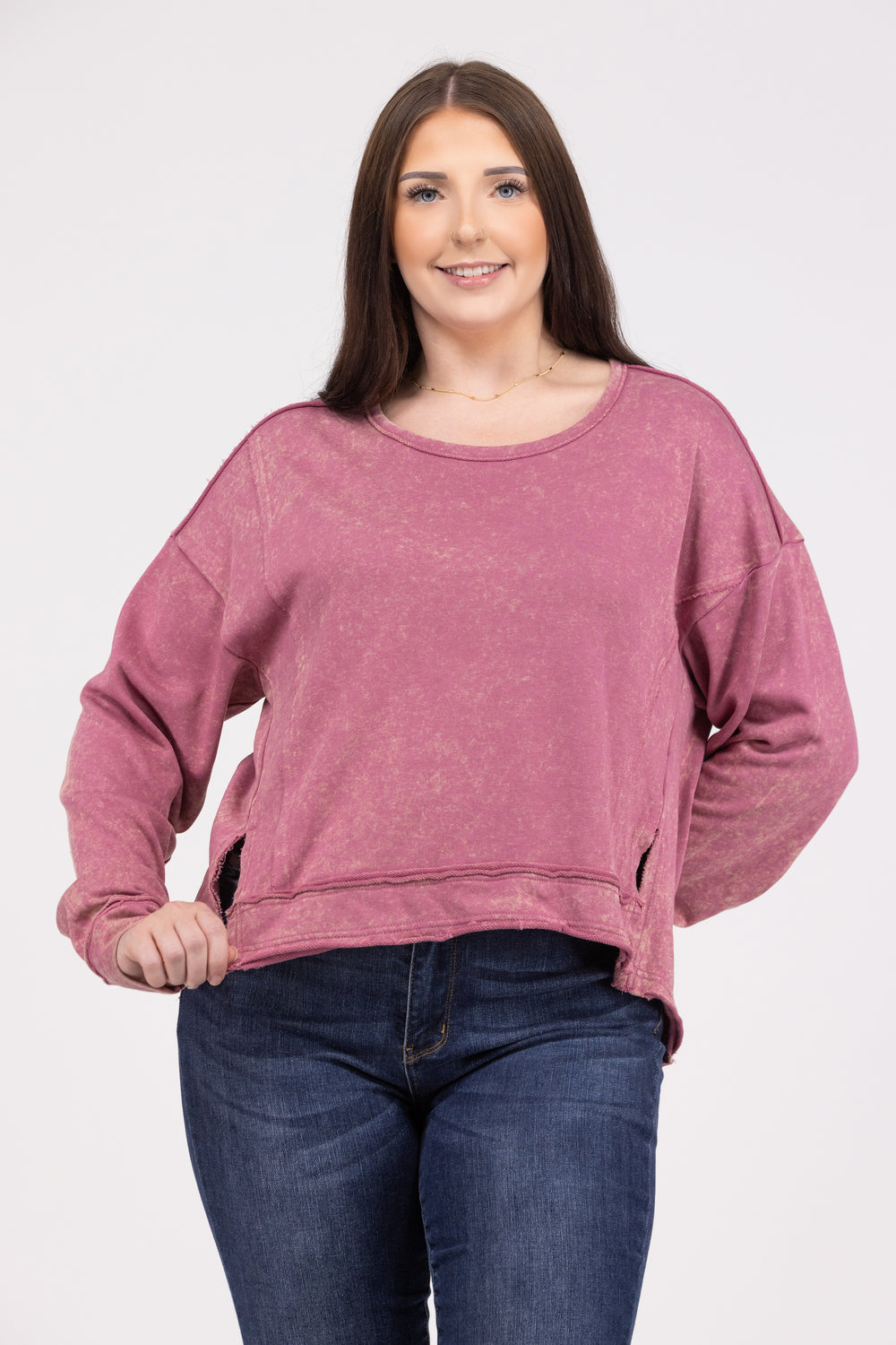The Won't Stay Down Long Sleeve Top from Very J will make you feel like no matter what life throws at you, you will always keep going! This top features side slits, long sleeves, a Hi-lo hem, and a vintage wash. Pair with your favorite denim and never stay down!