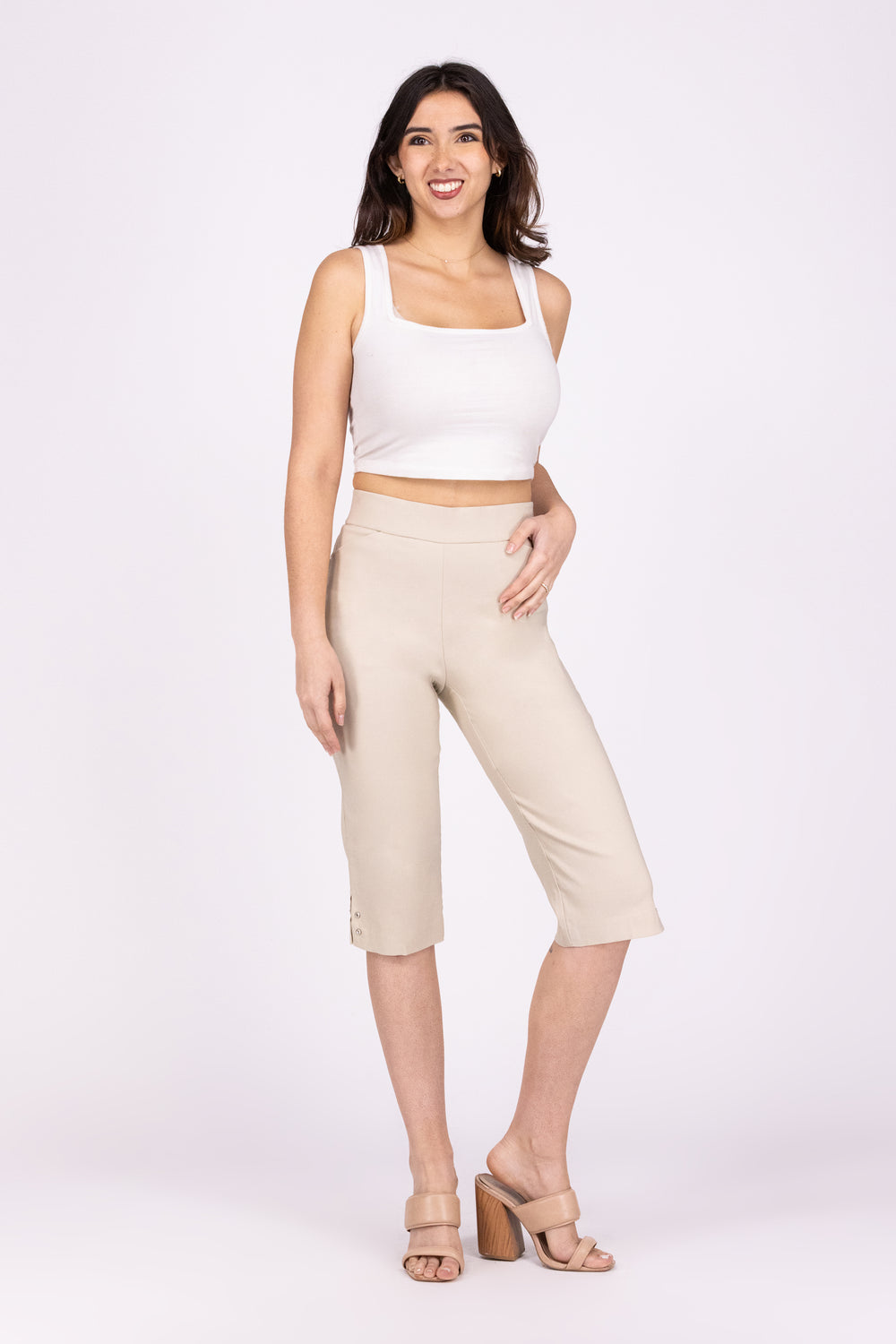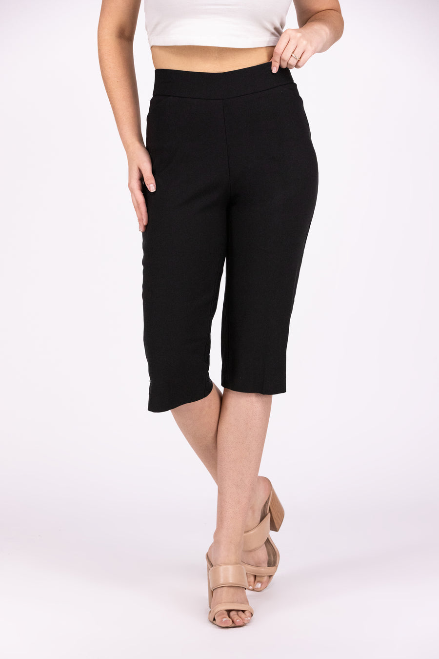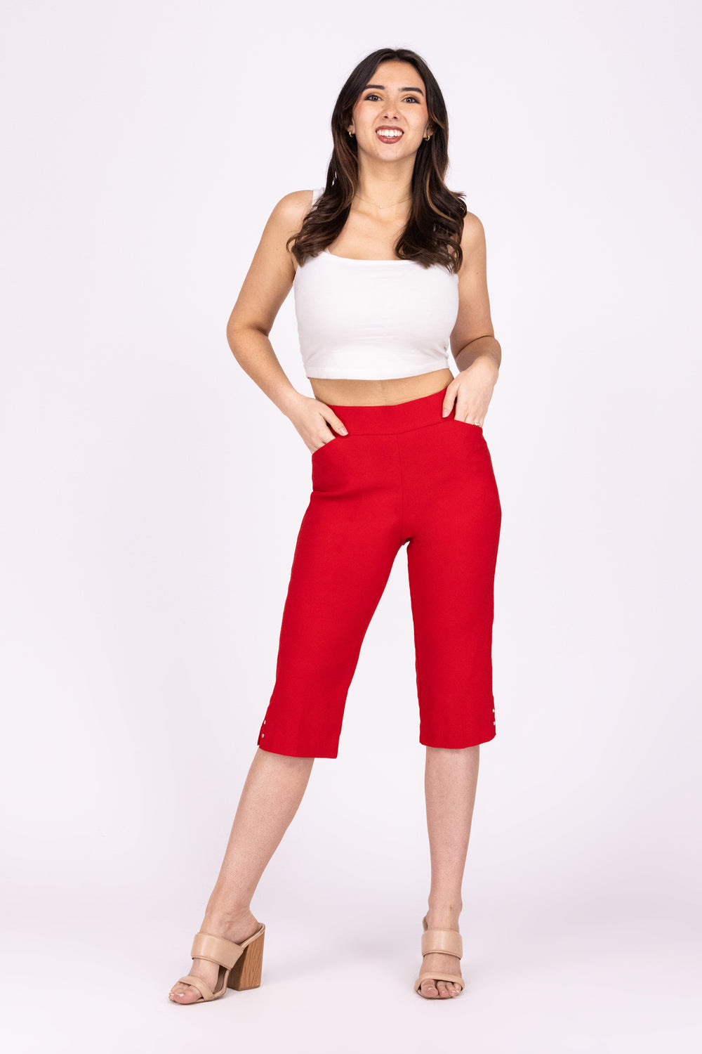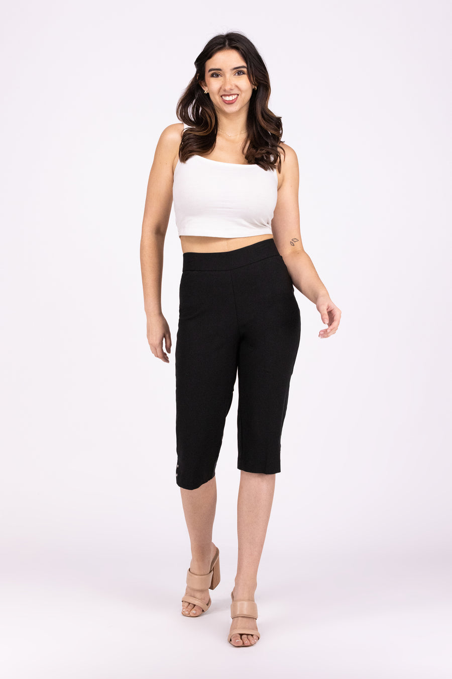 These capris by Pine Apparel are the perfect combination between classy and business! They are super soft and very stretchy, but they do mold to your shape perfectly. These capris are mid-rise, two front pockets, rhinestone detailing, a small slit on each side with straight hemline.