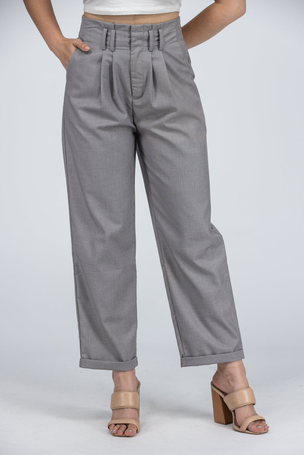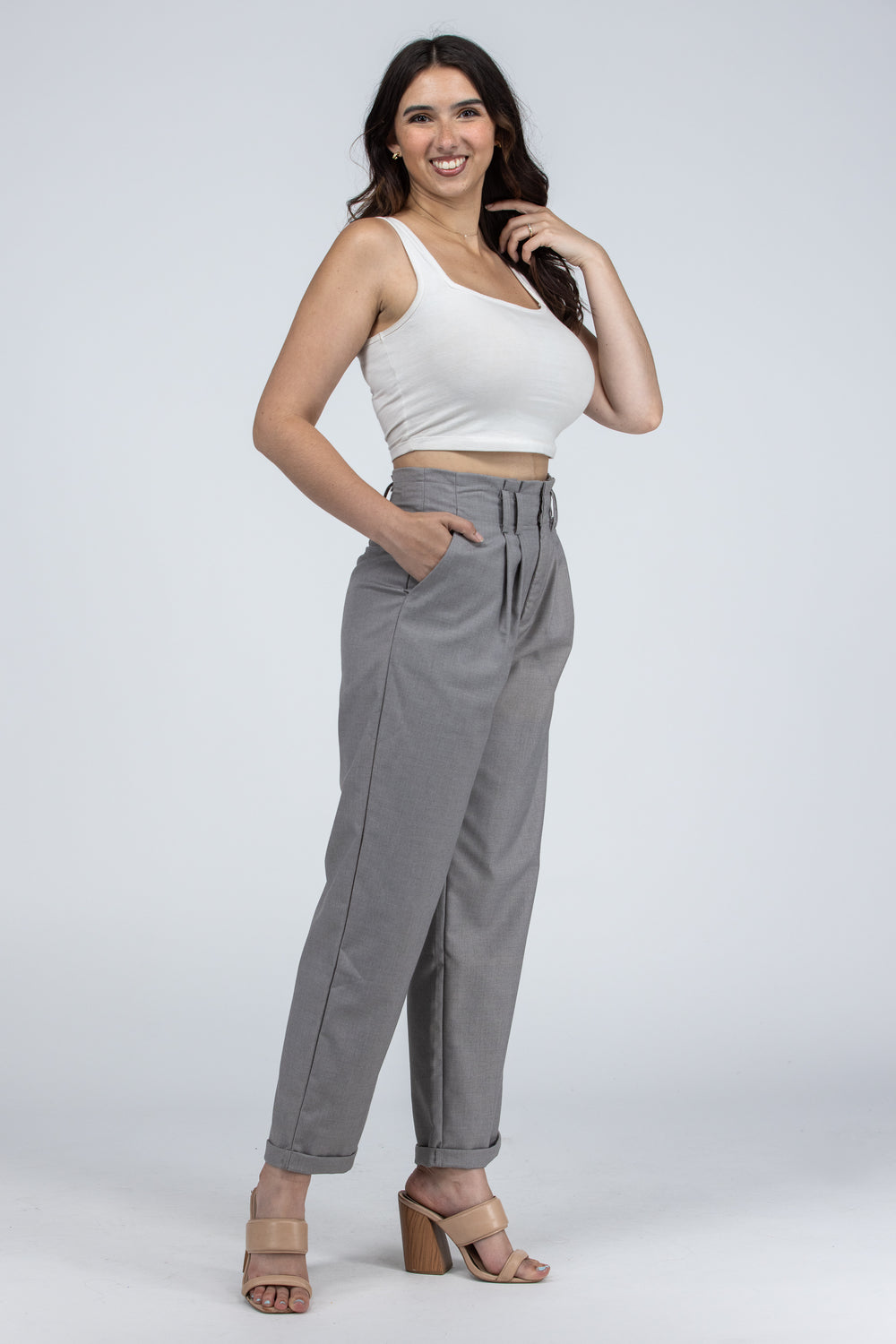 Working It Pants is the perfect blend between a dress pant with comfortability. The waistband features not only belt loops but a small elastic waistband at the back. They have pockets at side seams and at back. The hem of the pants also have a cuff.