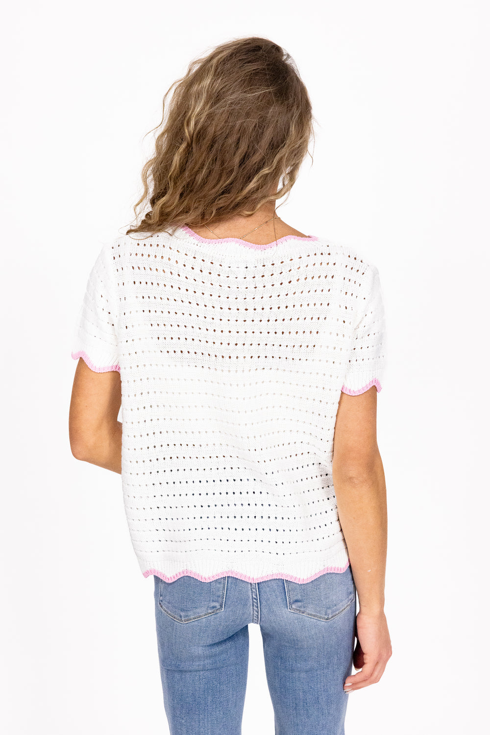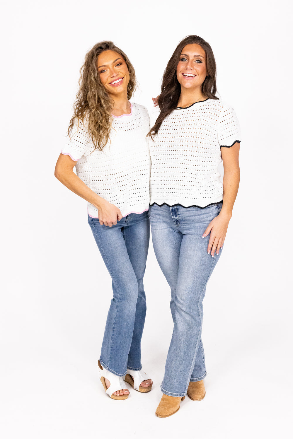 Delicate, feminine, and effortlessly stylish, the Scalloped Edge Knit Top is the perfect blend of vintage charm and modern style. Featuring a lightweight open-knit design, this top is both breathable and stylish, making it a go-to for layering or warm-weather wear. The scalloped edges and contrast trim add a touch of elegance, while the soft fabric blend ensures a comfortable fit. Available in two timeless color options, off white with black trim and off white with pink trim, this versatile top pairs beautifully with denim, skirts, or layered over a cami for a trendy look.