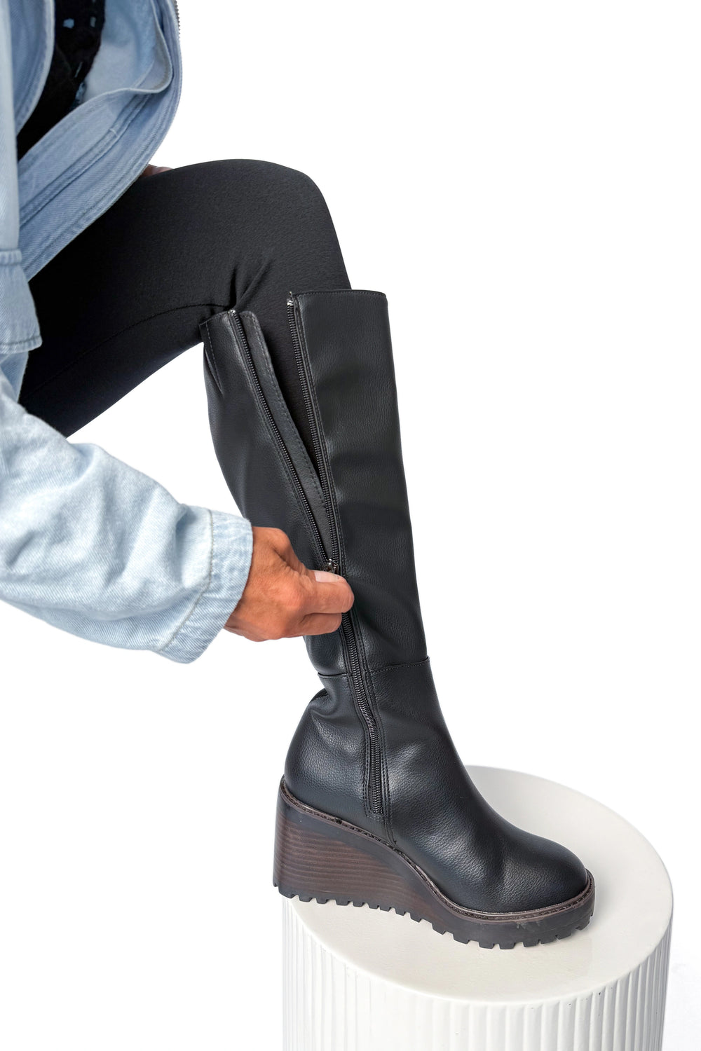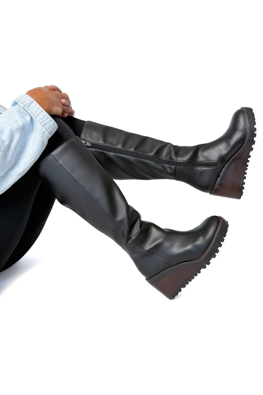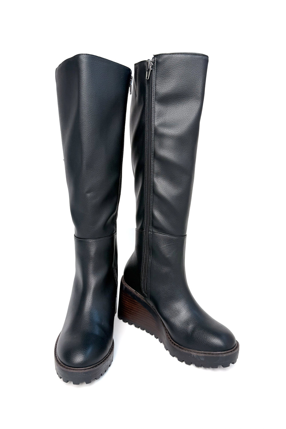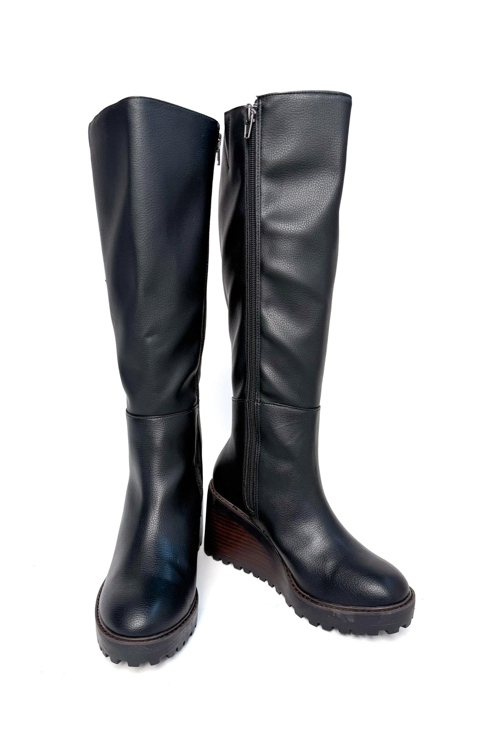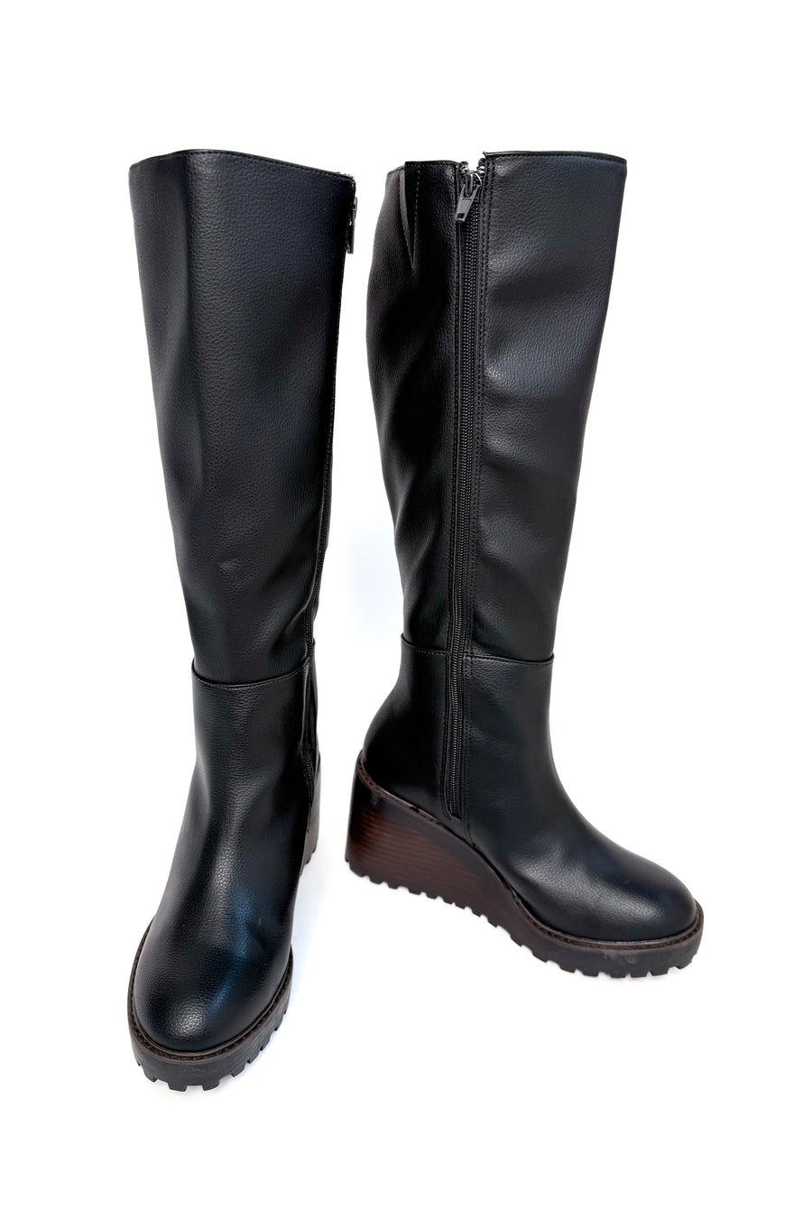Step out in style with the Yellow Box Adrena Wedge Boot! These knee-high faux leather boots add a fun twist to your look with a comfortable wedge heel that lifts your confidence. Perfect for turning heads while keeping your feet cozy, they blend edgy charm with everyday wearability. The zip closure and round toe keep these boots practical and fashionable. Step confidently and make a statement wherever you go—these boots are a must-have addition to your collection.