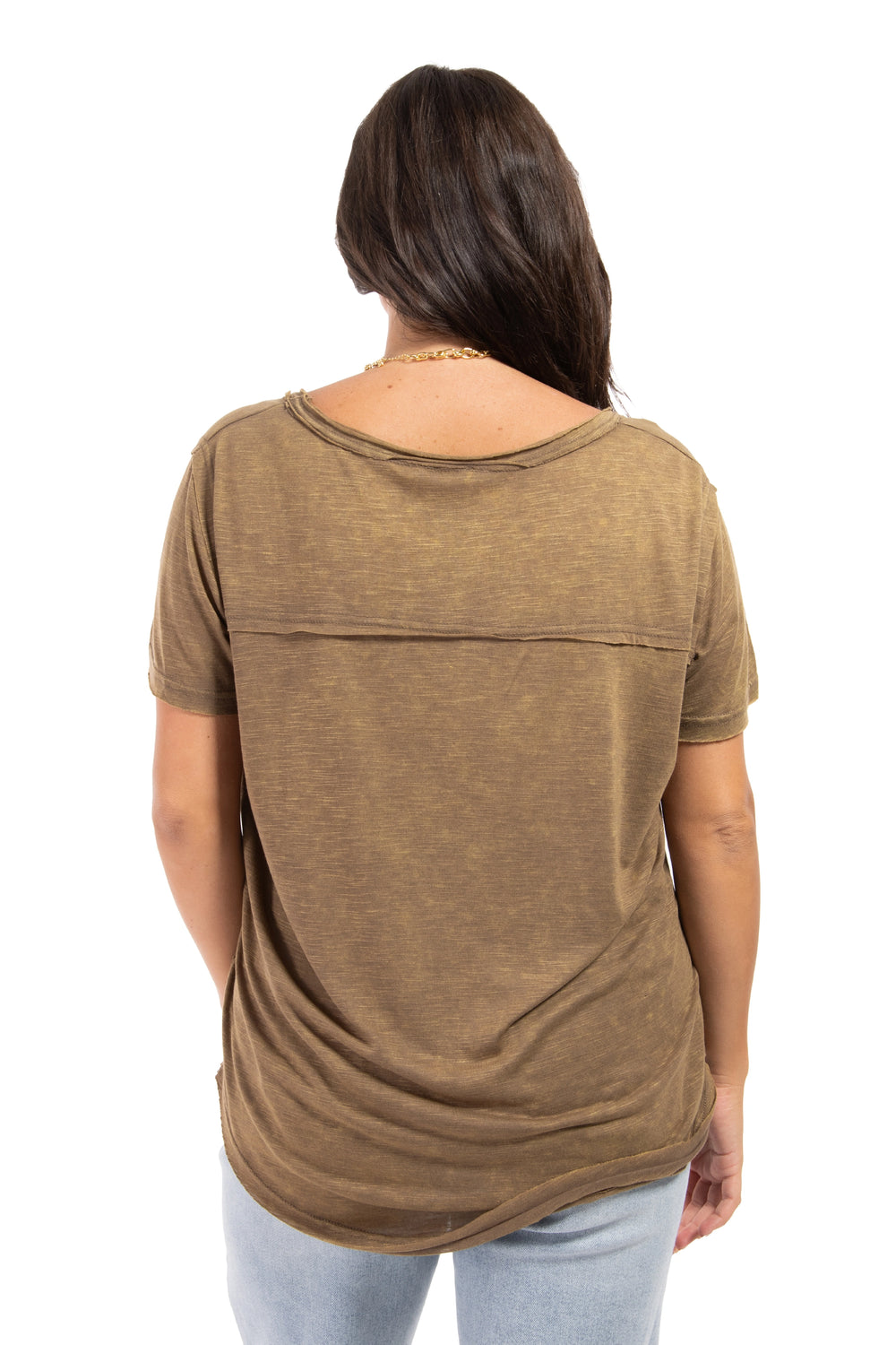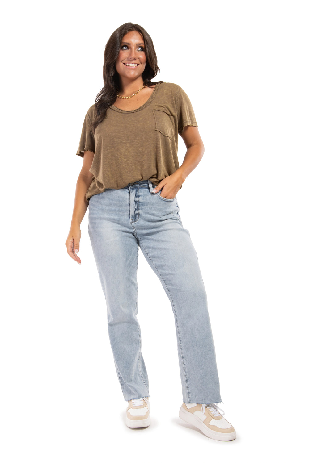 The Make Change Top by Pol is a relaxed fit, short sleeve top with a rough edged scoop neck, a front chest pocket, and a rounded hemline. This is the perfect throw and go top. Goes great with your favorite pair of denim!